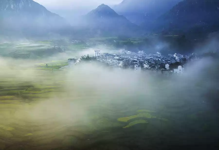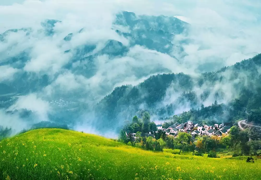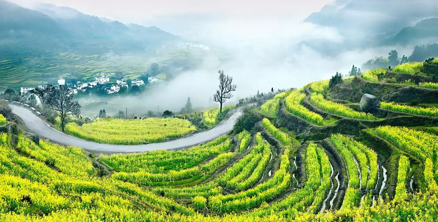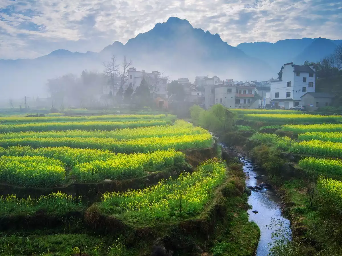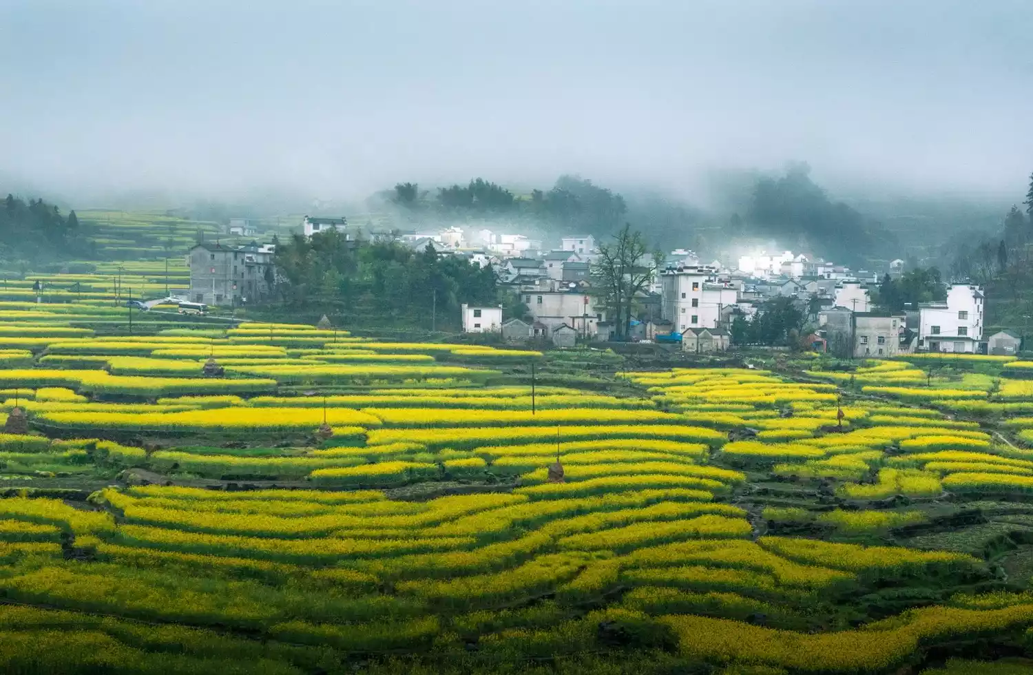 Every spring, Wuyuan, known as China's most beautiful countryside, enters its most beautiful season: rapeseed, radish, peach, and pear blossoms bloom in profusion, nestled among the ancient Huizhou villages, nestled among white walls, black tiles, and surrounded by clear waters. Like a childhood poem, the scene reaches its peak of beauty when the mist shrouds the area just after the rain.