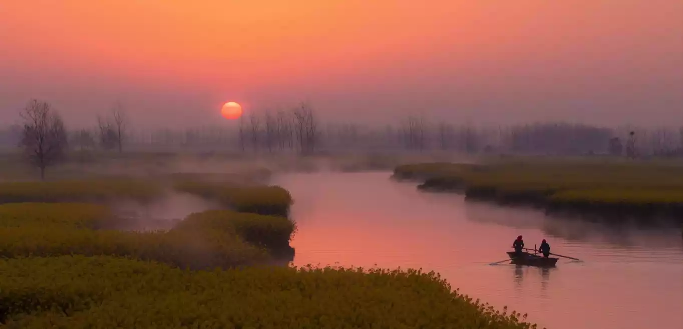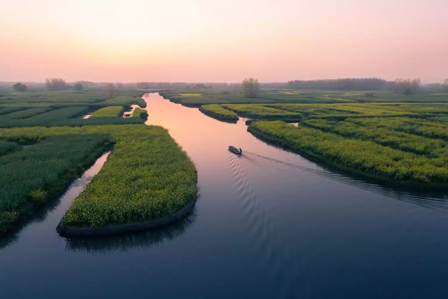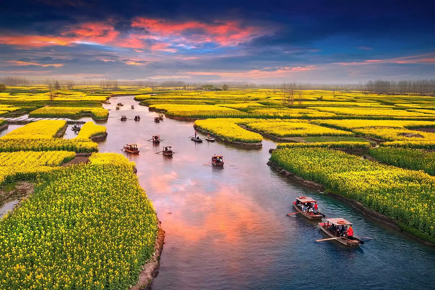 The rapeseed fields within Xinghua's Qiandao Rapeseed Park cover nearly 10,000 mu (approximately 10,000 acres). Thousands of raised fields float on the water, creating a breathtaking spectacle of clouds and mist. The rapeseed flowers of Xinghua, Jiangsu, are in full bloom. Here, the elegance of a wooden boat ride rivals that of a gondola, and the charm of the flower fields rivals the complexity of Venice's waterways... Every turn is a journey through the flower fields, a journey of self-congratulation.