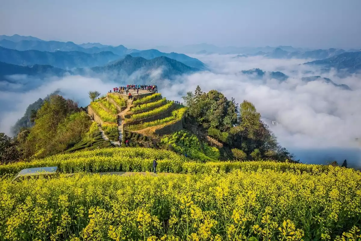 In March and April, the cauliflowers of Anhui's Jiapeng Terraces bloom discreetly. Nestled between ancient villages and towering peaks, they form a "hidden sea of flower terraces." There are no tour groups here, only hikers and photographers. Visit now before it becomes the next bustling Wuyuan. There's a magnificent viewing platform perfect for photography, including a 360-degree super viewing platform – breathtaking!