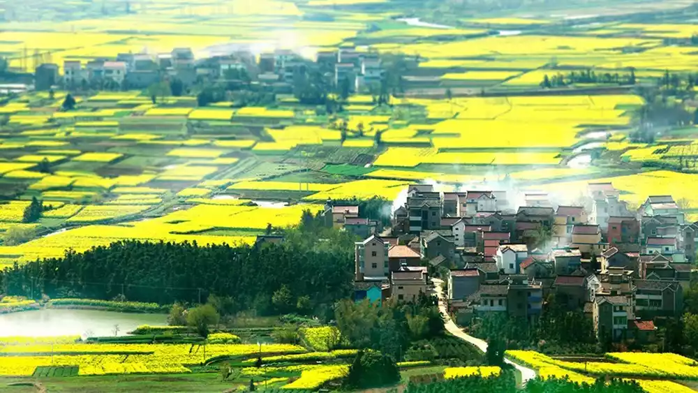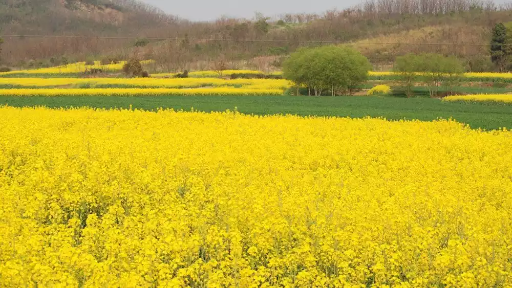 Gaochun, located near Nanjing, experiences lower temperatures than Shitan, Anhui, and Wuyuan, Jiangxi, resulting in a later bloom. By late March, Gaochun's rapeseed blossoms are in full bloom. The Rapeseed Flower Festival lasts over a month, and the flowers are expected to remain in full bloom during the Qingming Festival. A visit to Gaochun is a must-see for admiring the blooming rapeseed blossoms blanketing the mountains and experiencing the leisurely pleasure of wandering amidst a sea of golden blossoms. As a long-standing traditional industry in Gaochun, rapeseed blossoms are predominantly found in hilly and mountainous areas, creating a rich tapestry of layers and a rich rural atmosphere. Nearly 200,000 mu (approximately 1,000 acres) of high-quality rapeseed fields present a thriving scene.