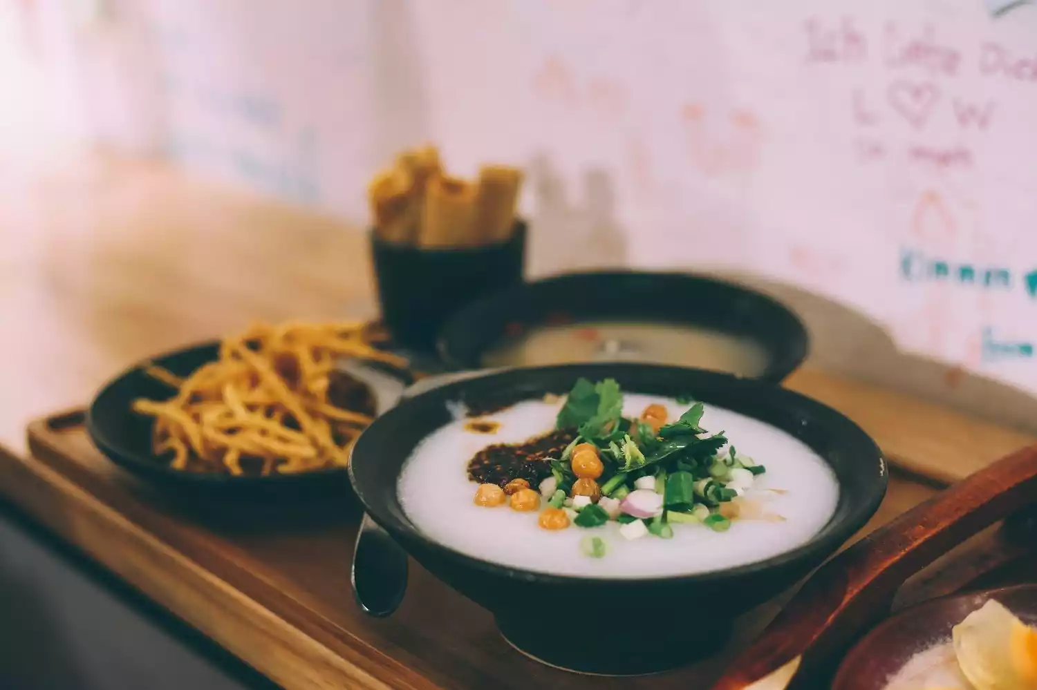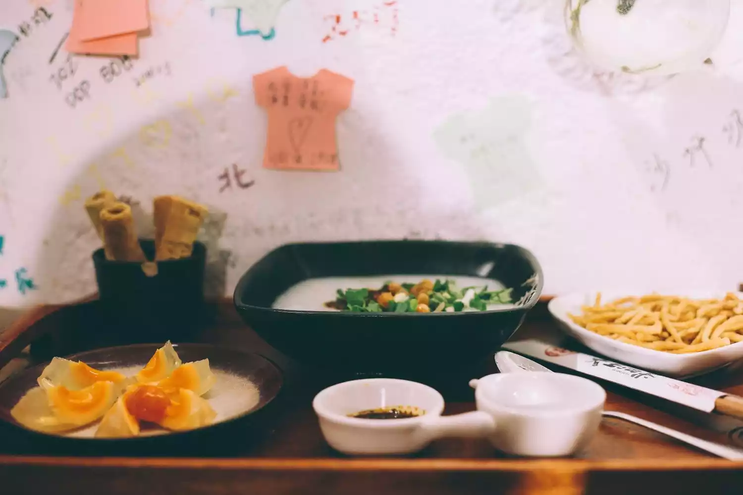 △Classic oil tea set meal, 25 yuan/serving: includes a serving of oil tea, four egg rolls, and sweet rice wine.