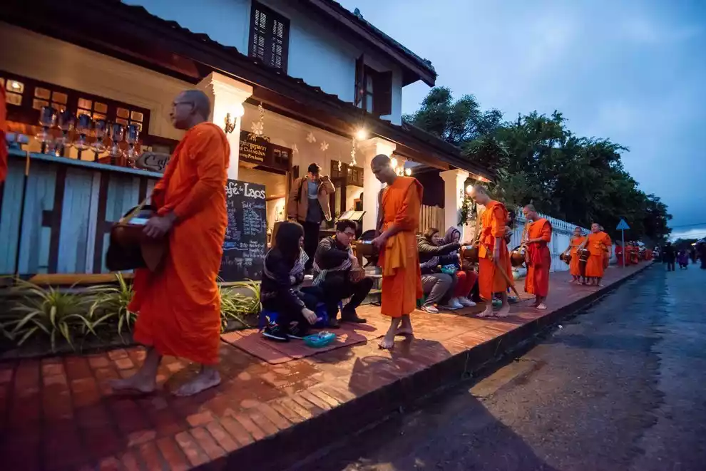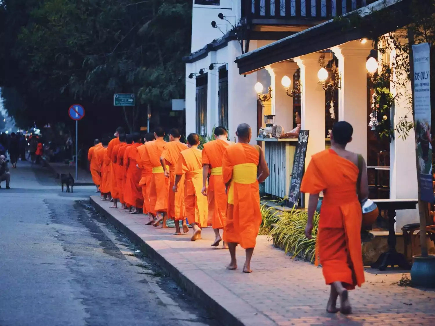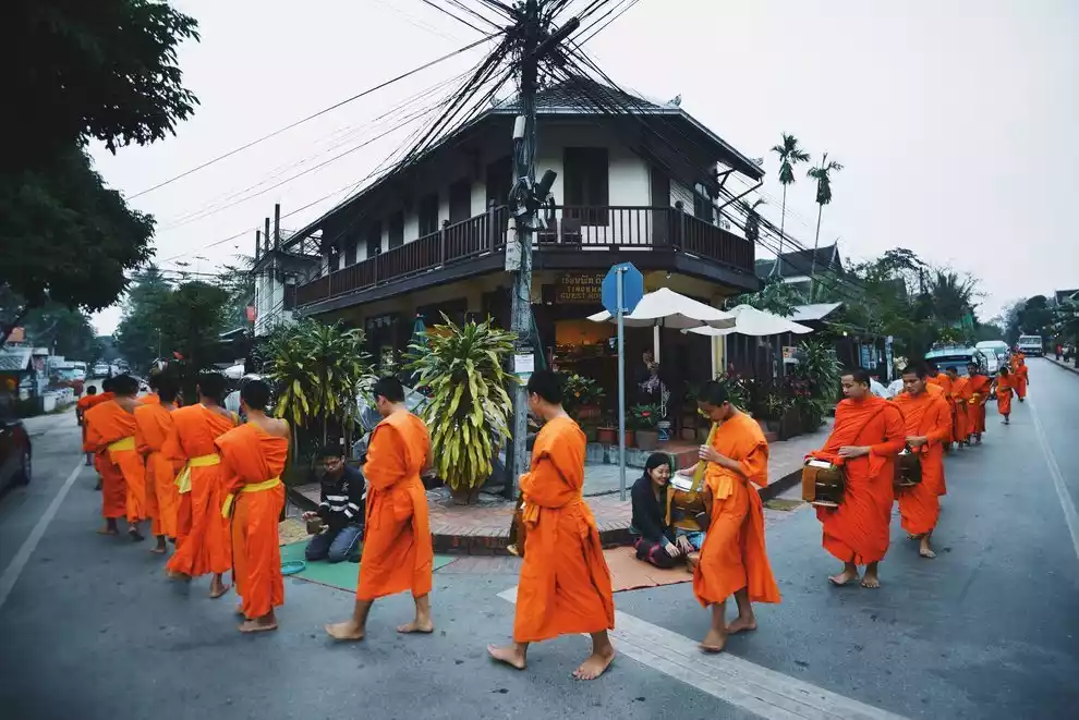 Luang Prabang has a sacred tradition: every morning, monks line up, carrying their alms bowls and walking through the streets. As the first rays of sunlight illuminate the golden temple dome, yellow robes appear from afar. The monks, barefoot, slowly approach, while locals prepare food and fruits and vegetables, kneel, hands clasped in reverent prayer, and wait quietly by the roadside. When the monks approach, the donor reverently places rice into the alms bowl. The monks then bow, chant, and depart. This daily ritual, known locally as the "Morning Alms Giving," is a must-see experience in Luang Prabang's Old Town. Alms giving is a tradition preserved for thousands of years in Theravada Buddhist countries. Visitors typically gather near the temples on Sisavangvong Road. At 5 or 6 a.m., you can see the monks, barefoot and carrying tin plaster, accepting food from believers and tourists.