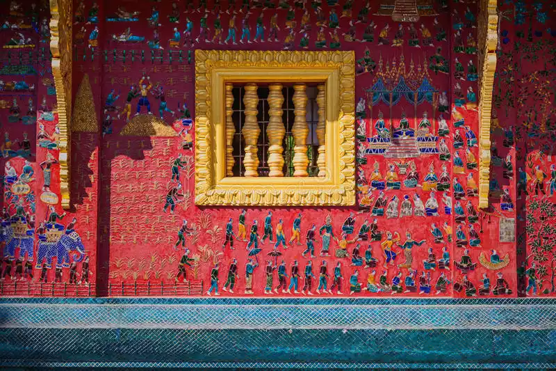 To describe Wat Xieng Thong as "golden and magnificent" is no exaggeration. Inside, the temple's door lintels, large and small, are intricately carved with intricate patterns, creating a striking contrast against the black temple walls. The exterior is also covered in golden designs. The pillars and door lintels often feature enchanting tropical branches, while the doors feature graceful, intricately carved reliefs of fairies or Buddha statues. The temple's 20 exquisitely decorated buildings embody a comprehensive reflection of Laotian religion, royalty, and traditional art.