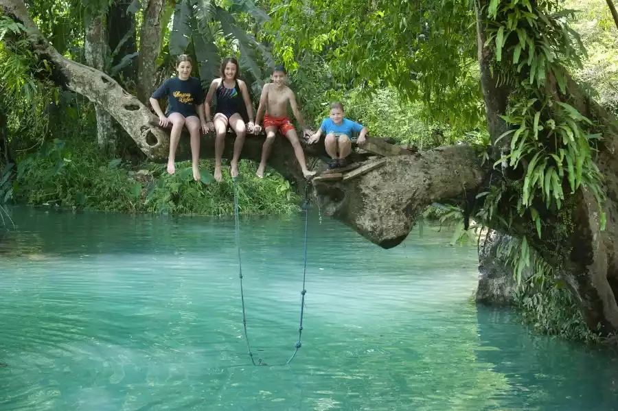Besides enjoying the stunning scenery, the most fun activity at Guangxi Waterfall is rope diving. Tree trunks jutting out of the water at the edge of the pool create natural diving platforms, allowing you to leap from the trees into the crystal-clear waters. Even if you're not a fan of diving, playing and swimming in the pristine, pale blue waters is incredibly relaxing and refreshing. Furthermore, the water is rich in minerals and contains small fish that feed on dead skin, making it incredibly beneficial for the skin. Soaking in the pools feels like a natural spa treatment, a truly enjoyable experience. The stunning scenery and engaging activities make this a perfect summer escape.