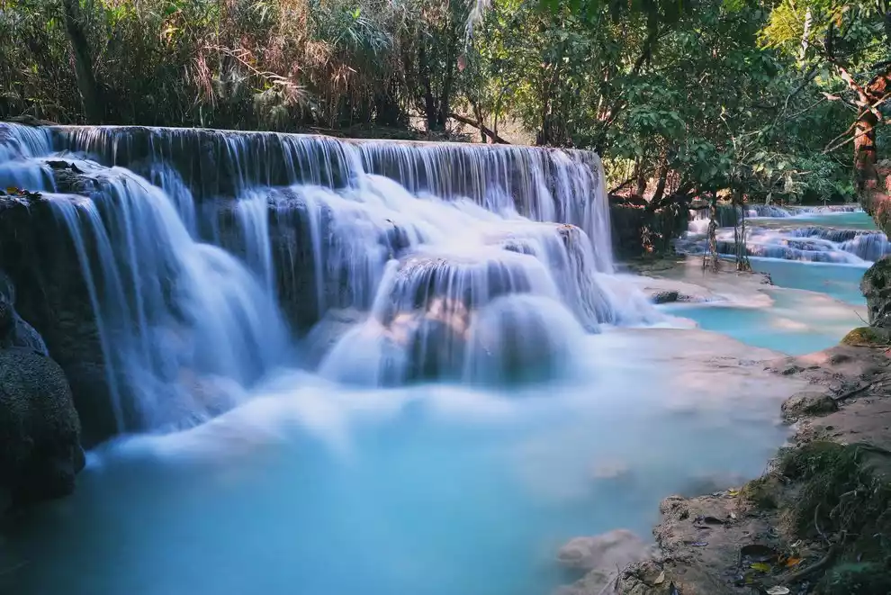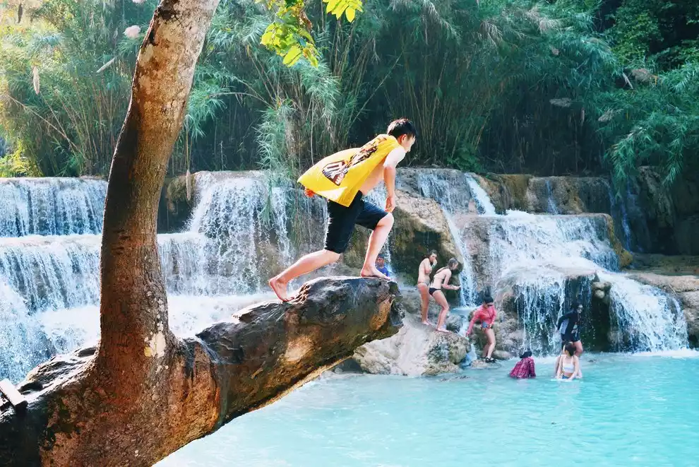 While Luang Prabang boasts four major waterfalls, Kuang Si Falls consistently ranks first on various recommendations. If you have the time, don't miss it. Kuang Si Falls boasts a magnificent display of cascading waterfalls from a distance, but its most famous attraction is undoubtedly the rope diving. Entering from the waterfall park on the lower level, follow a small path up through the woods to the left of the falls to reach the second tier. The pool in front of the falls is large enough for a refreshing swim. A word of caution: don't rush out of the water if you fall in, as there are many small fish that will nibble on your skin, making it a natural, free fish therapy experience!