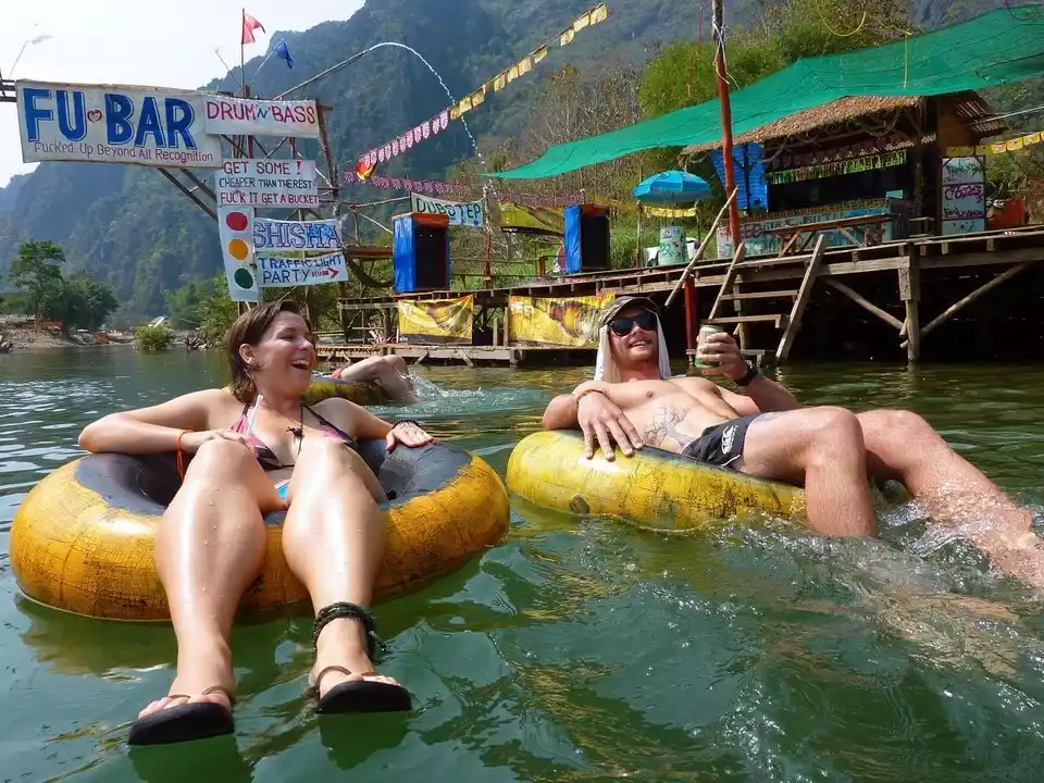 The Nam Song River is a famous rafting destination in Vang Vieng. The river is wide, with both rapids and calm waters, and the entire rafting journey is approximately 13 kilometers. There are two options for rafting: you can choose to sit in a car inner tube and drift slowly along the current, or you can choose to kayak for a faster and more exciting experience.