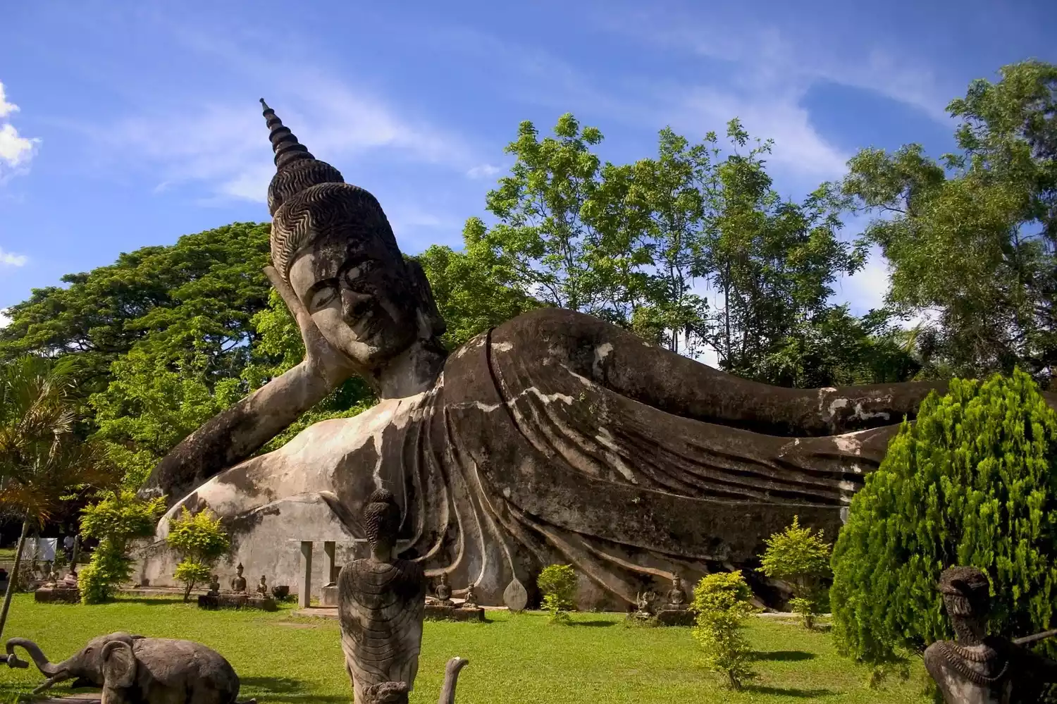 Buddha Park, also known as Wat Xiangkun, is located on the banks of the Mekong River, approximately 25 kilometers southeast of Vientiane. It is a sculpture park featuring nearly 100 Buddha statues of various shapes and sizes, blending Buddhist and Hindu influences. The pumpkin-shaped "Heaven and Hell Tower," symbolizing the cycle of life, and the over 40-meter-long reclining Buddha statue are two of the park's main attractions.