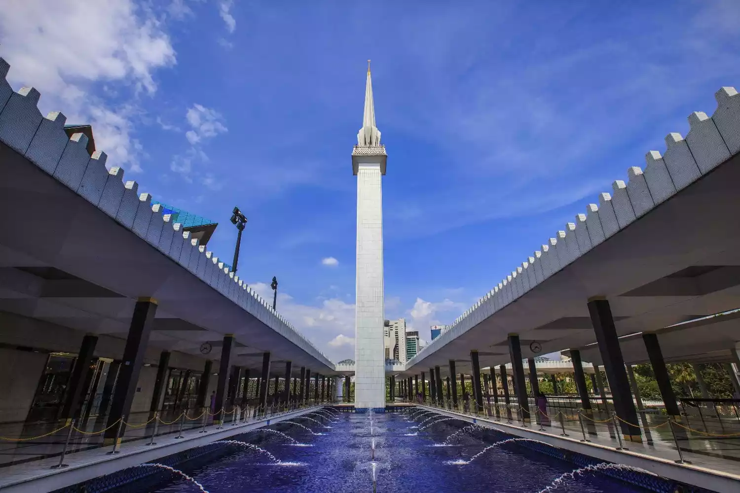The 73-meter-tall minaret resembles a rocket, creating a unique contrast with the adjacent prayer hall. The 18 surrounding spires represent the 13 states of Malaysia and the five tenets of Islam.