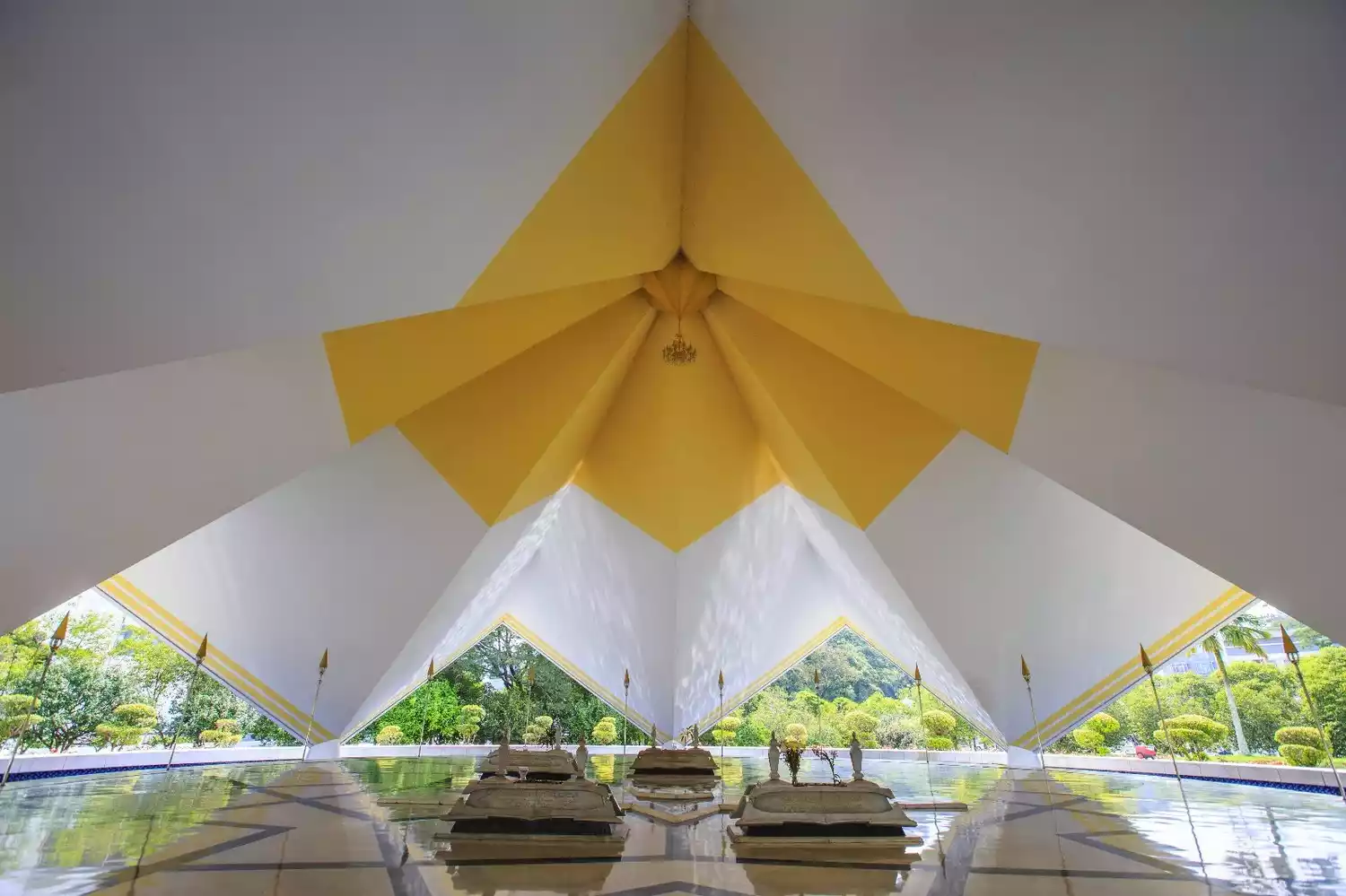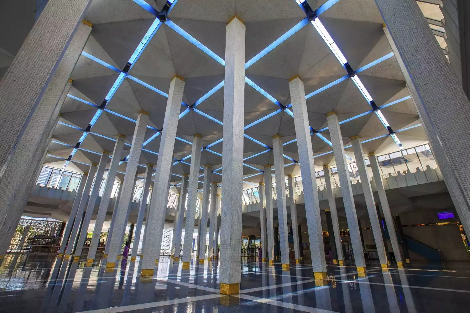 Further inside is the spacious and lofty prayer hall, capable of accommodating 8,000 people. The hall's roof is composed of 49 arches of varying sizes, the largest measuring 45 meters in diameter. The arches are arranged in 18 radiating star-shaped patterns, representing the 13 states of Malaysia and the five tenets of Islam. However, despite its ornate decorations, non-Muslims are not allowed inside, so many visitors are limited to taking photos of the interior from the outside.