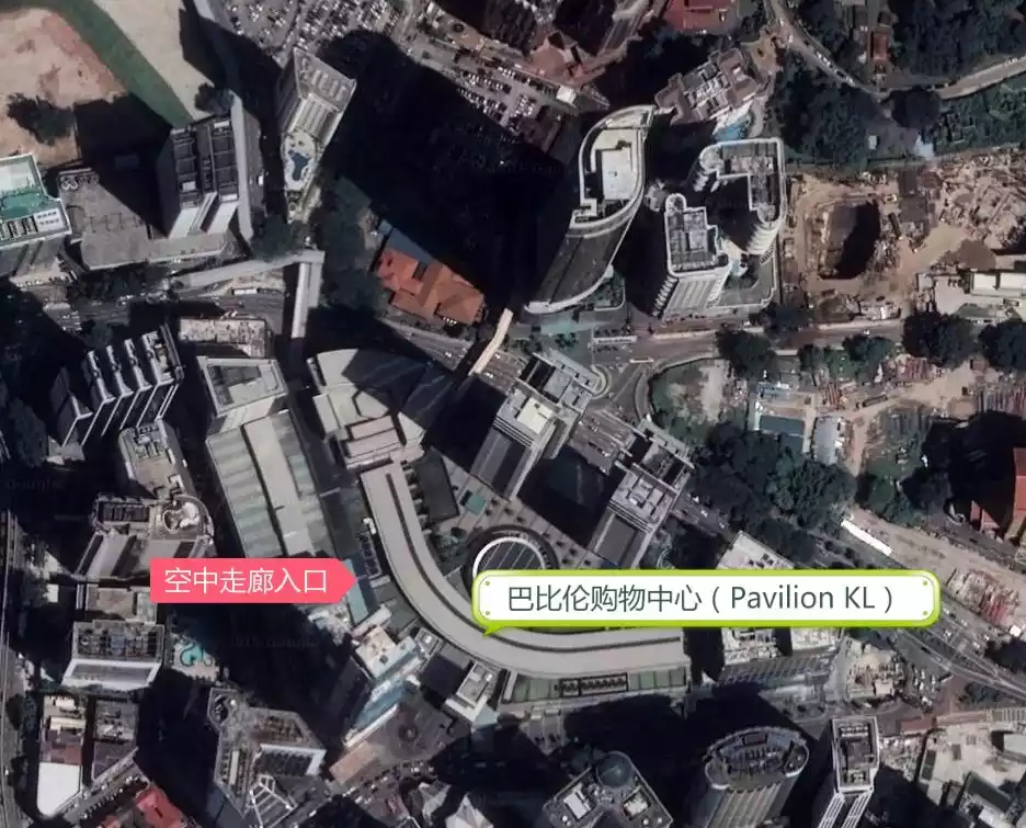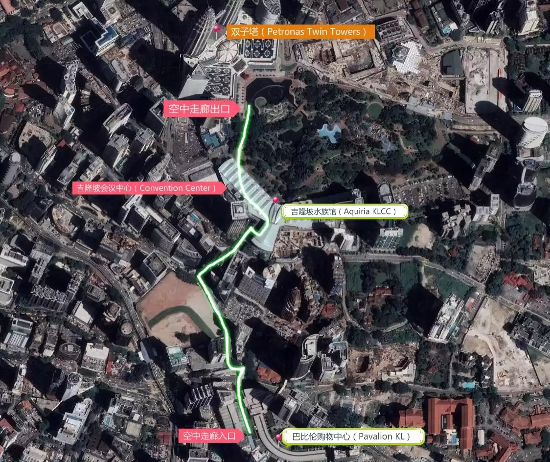 1. The entrance to the skywalk is on the left side of Pavilion KL. Walk for about 20 minutes and go down the stairs. The Aquaria Oceanarium is on the left. Across the entire building is the park under the Petronas Twin Towers.