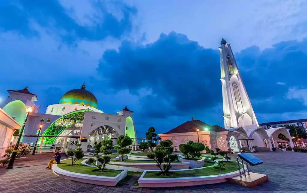 The Malacca Straits Mosque is located on the artificial island of Malacca. When the water level is high, it appears as a floating structure. The sunset is breathtaking, with the chanting from the radio intertwined with the crash of the waves. The setting sun casts a shadow against the golden dome, and it's a delightful experience to sit on the seaside embankment and admire the view. After dark, the mosque is illuminated, transforming the entire structure into a vibrant, enchanting spectacle.