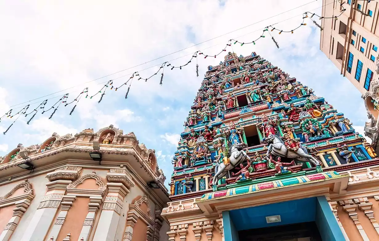 Locals offer flowers, incense, coconuts, and lime strings to Mariamman, an incarnation of the South Indian goddess Durga. During Thaipusam, an image of the deity from the temple is placed on a silver chariot and paraded from here to the Batu Caves.