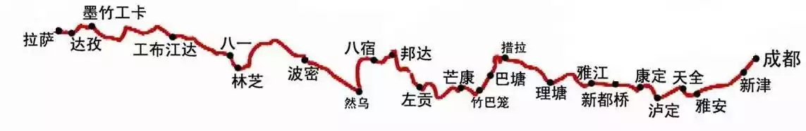 Starting from Chengdu, the route passes through Erlang Mountain (2170 meters), Zheduo Mountain (4298 meters), Gaolusi Mountain (4412 meters), Jianziwan Mountain (4659 meters), Kazila Mountain (4718 meters), Haizi Mountain (4500 meters), Zongla Mountain (4150 meters), Lawu Mountain (4376 meters), Jueba Mountain (3930 meters), Dongda Mountain (5008 meters), Yela Mountain (4658 meters), Anjiula Mountain (4468 meters), Sejila Mountain (4728 meters), and Mila Mountain (5013 meters), before arriving in Lhasa.