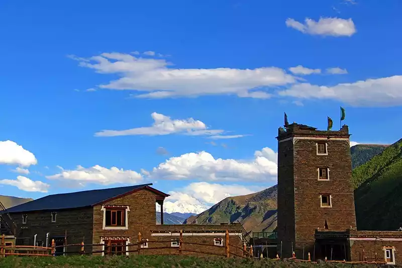 The Tibetan-style dwellings of Xinduqiao are distinctive, with spacious white-walled courtyards and vermilion-lacquered gates. Most are built of stone and face the sun, allowing for abundant natural light. Each building features three or four windows on each wall, with sun, moon, or triangular patterns painted in red, black, and white, symbolizing a prosperous population and a bountiful harvest. Driving along the Xinduqiao section of the road, one feels as if the curtains of "Shangri-La" are gradually opening. There, life and nature, people and the environment, peace and tranquility blossom in harmony. The sky's ever-changing colors make one forget the hardships of the journey.