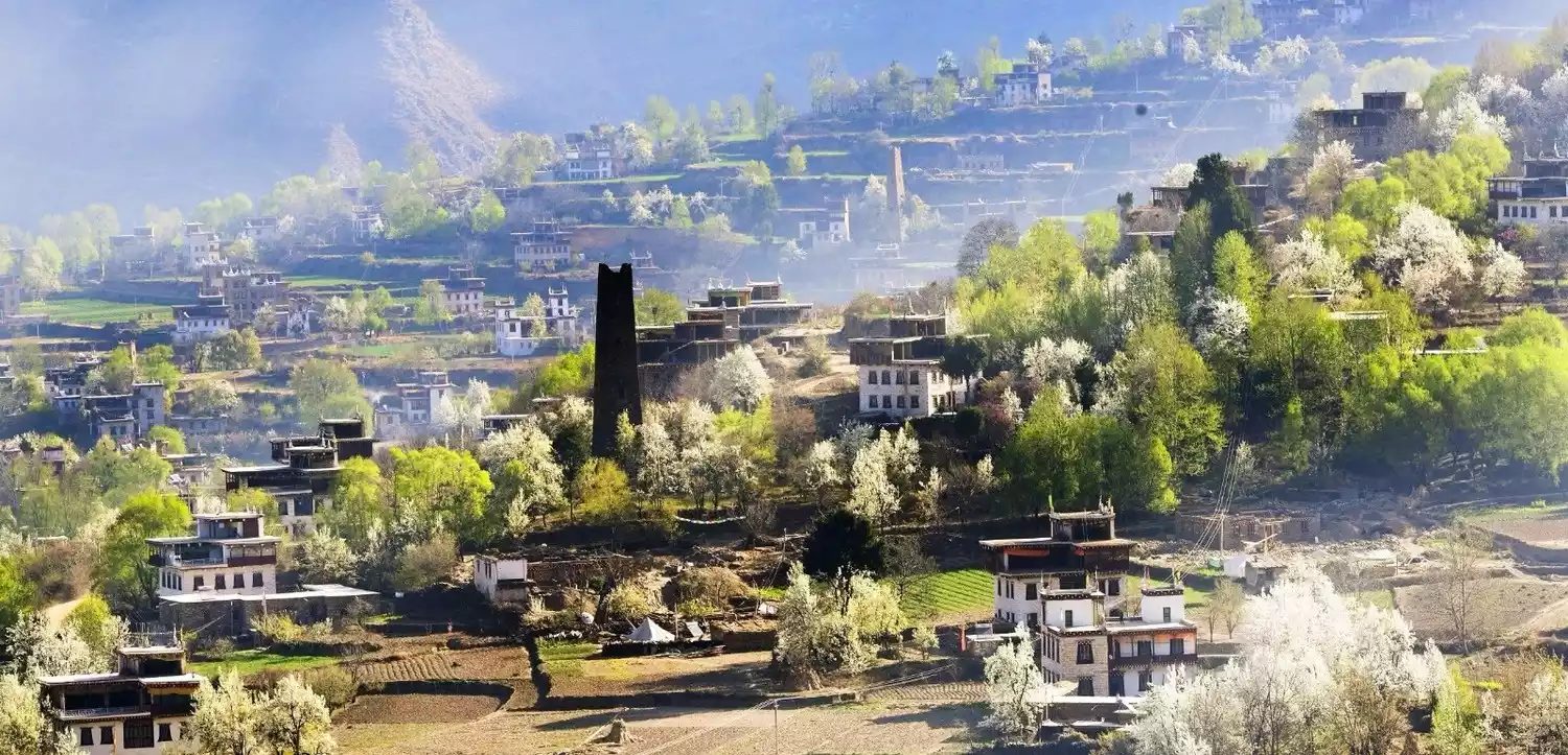 Danba Tibetan Village is the most distinctive of the Jiarong Tibetan villages. Jiaju, Niejia, Geshizha, and Badi Townships are particularly striking. Hundreds of dwellings, meticulously arranged and nestled into the natural landscape, embody the concept of harmony between man and nature. From afar, amidst the emerald greenery of the valley, lush fields and village houses nestled deep in the forest, accompanied by the occasional gurgling stream, unfold a dynamic and breathtaking landscape of the village. In 2005, National Geographic China ranked Danba Tibetan Village as the top of the six most beautiful ancient towns and villages in China.