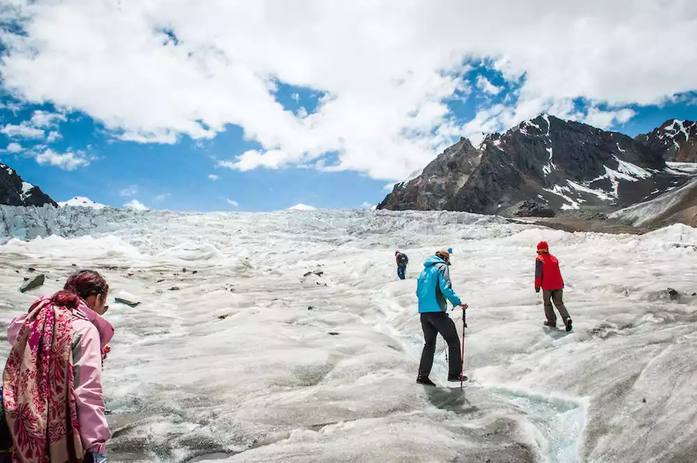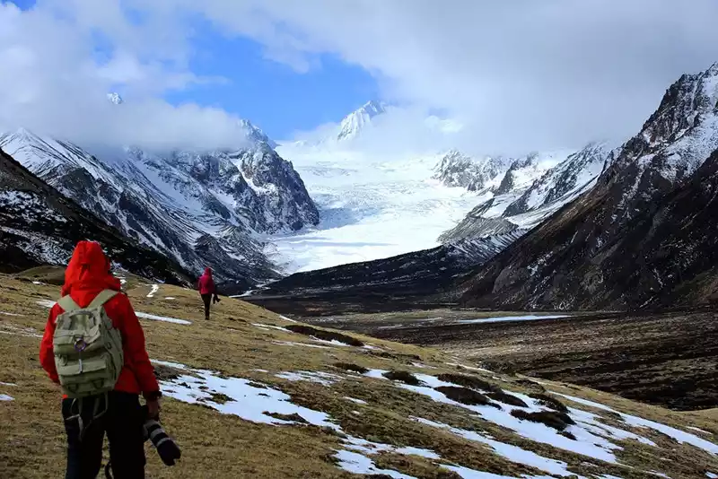 The next day, you can hire a local guide or charter a car to visit Renlongba Glacier, the "Father of Ten Thousand Years of Glaciers." Unlike the Laigu and Midui Glaciers, which have become renowned tourist attractions, Renlongba Glacier remains untouched and pristine, hidden deep in the mountains and little known to the public. However, its scale and grandeur rival those of the two. Because it's untouched and relatively unknown, you'll need a local driver to reach the entrance. Then, you'll hike through meadows and streams to the foot of the glacier, where you'll get up close and personal with the glacier. Our round-trip hike took over six hours.