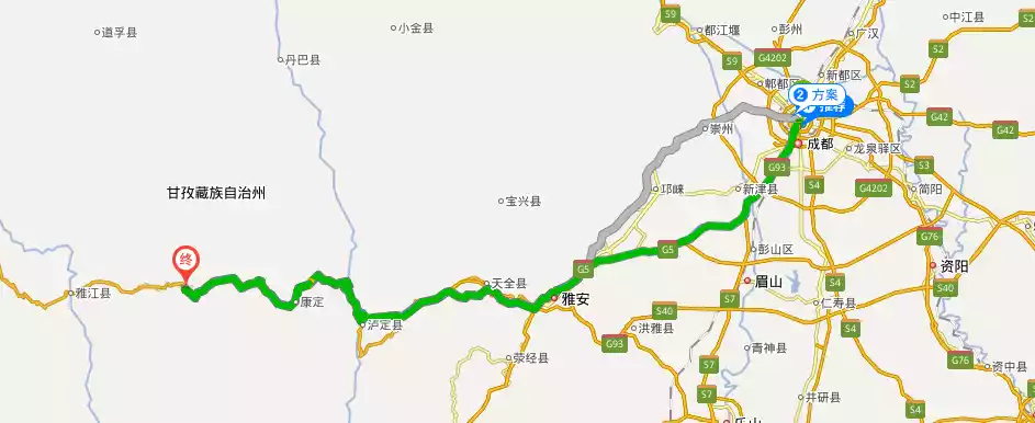 The Chengdu-Kangding Expressway has been fully opened to traffic. Generally, if you drive on the first day, you can directly reach Xinduqiao, which is the end point of the above map, while if you cycle on the first day, you can only reach Ya'an.