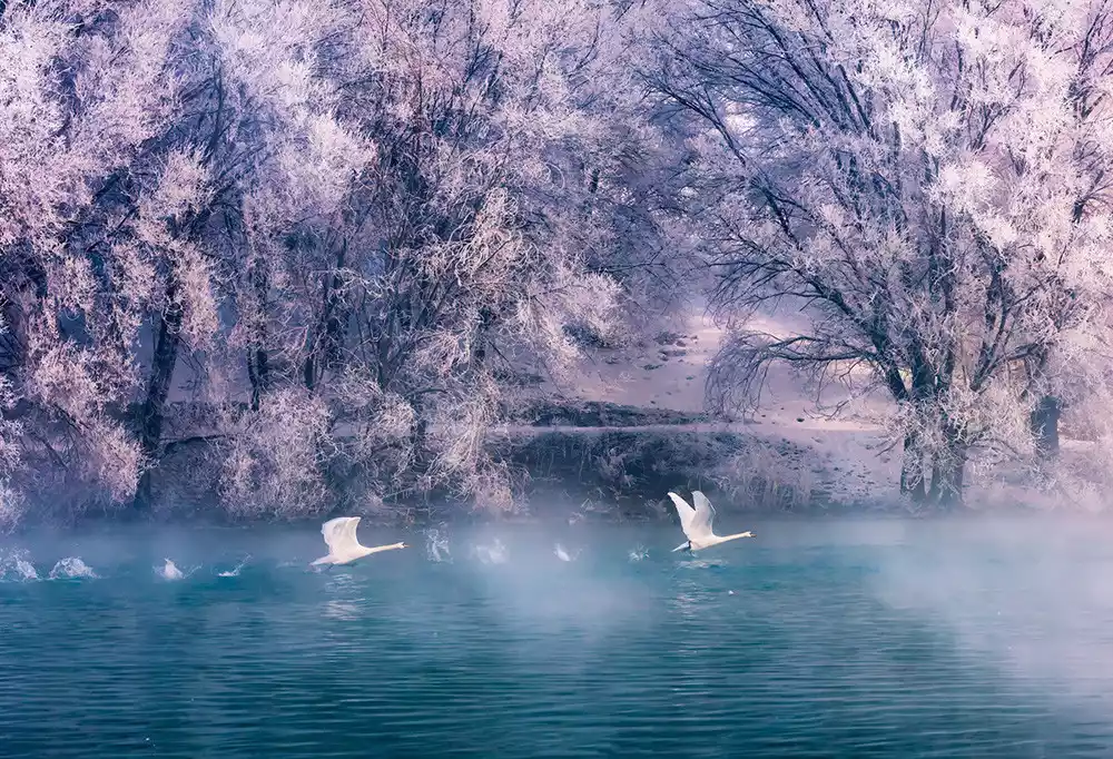 On the north bank of the Ili River, in Yingtamu Township, Yining County, lies the small village of Xiahelike. This remote, obscure spot has gained immense fame in recent years thanks to the man-made "Swan Lake." Every morning, you can experience an immersive, natural version of the ballet "Swan Lake": the rising sun, like a fiery red ball, heralds the dawn over the vast expanse of the earth with its vibrant glow. Gradually, the rime on the lakeside trees and reeds turns a golden hue, while wisps of mist rise from the clear, tranquil waters, creating a hazy, ethereal scene that evokes a sense of being transported to another world. At this moment, nature's spirits awaken! The beautiful swans begin their song, welcoming the dawn; their resonant, resonant voices sing of life, a celebration of life itself. At the same time, the swans stretched their necks and spread their wings, dancing gracefully with the flocks of wild ducks and other waterfowl, forming a graceful and vibrant natural spectacle that makes people linger and marvel.