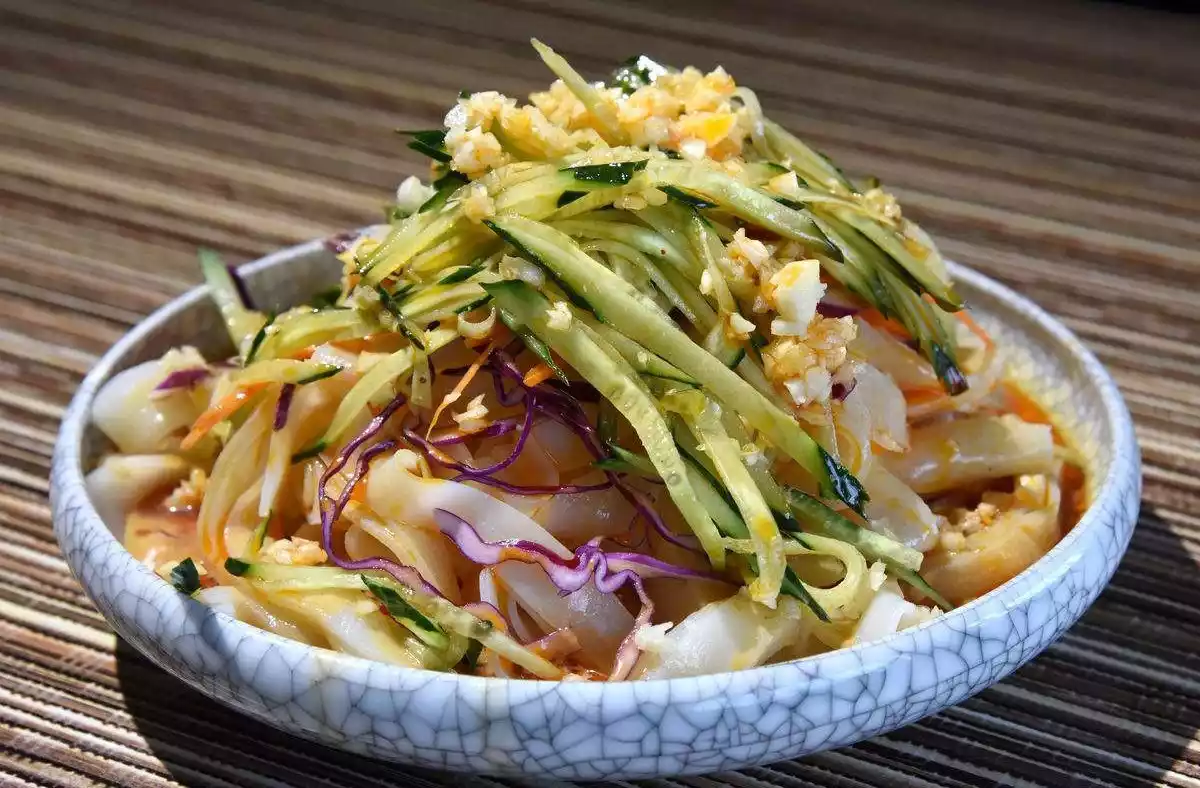Liangfen (jelly jelly) is a popular snack in Yili. While its preparation is simple, the ingredients are demanding: pure pea starch, excellent seasoning, and cleanliness are crucial. The dough is kneaded with salt, alkali, and ash water, then pressed into a thin, silvery consistency. After cooking, rinse with cold water, and allow to dry before serving. If you've tried Yili jelly, you'll doubt whether jelly from other places can even be considered jelly.