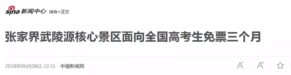 Just after the Gaokao (National College Entrance Examination) exam, the Wulingyuan Scenic Area in Zhangjiajie, Hunan Province, a World Heritage Site, announced that it would offer free admission to all Gaokao (National College Entrance Examination) students from June 12 to September 12, 2018. This is reportedly the first time a well-known tourist attraction in China has offered free admission to Gaokao (National College Entrance Examination) students.