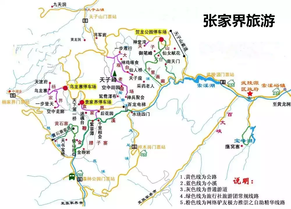 If you look at the picture carefully, you will find that Wulingyuan Scenic Area is also known as Zhangjiajie Forest Park, a must-see scenic area in Zhangjiajie. The attractions in it include Forest Park, Golden Whip Stream, Yuanjiajie, Yangjiajie, Tianzi Mountain, Ten-Li Gallery, etc. You only need to buy one ticket (a pass system, which allows you to visit all attractions in the scenic area, one ticket is valid for four days, and you can ride the eco-friendly car for free. Insurance is voluntary) to visit the above four major scenic areas. You can enter the scenic area from five ticket stations.