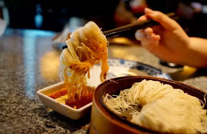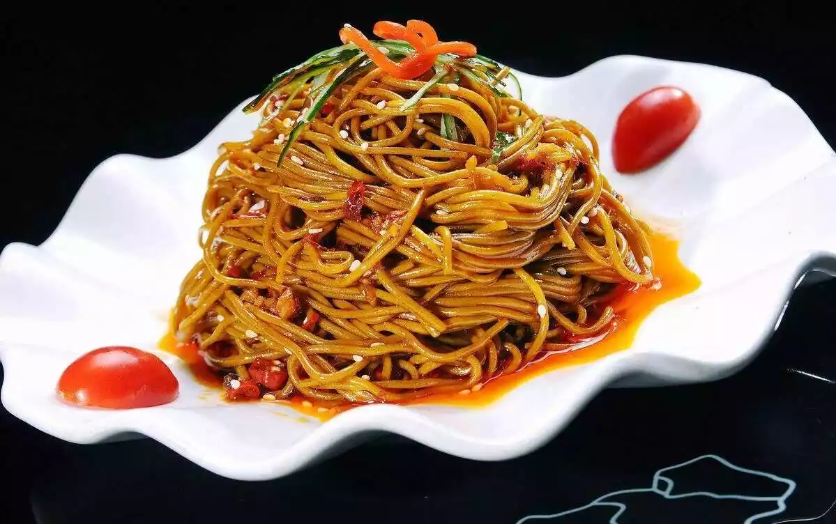 Shaanxi cold noodles are a traditional snack, mostly made with wheat flour, but also rice flour or other starches. They are usually eaten cold (though in Hanzhong, they are more commonly eaten hot). There are many varieties, each with its own unique preparation methods, seasonings, and flavors. Common varieties include sesame paste cold noodles, Qinzhen rice noodles, Hanzhong noodle noodles, Qishan rolled noodle noodles, and gluten cold noodles.