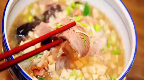 Xi'an is most famous for its beef and mutton soup with steamed buns. It is cooked with great care, with rich ingredients and mellow flavor. The meat is tender and the soup is thick. It is fat but not greasy, rich in nutrition, and full of fragrance. It is appetizing and leaves a long aftertaste.