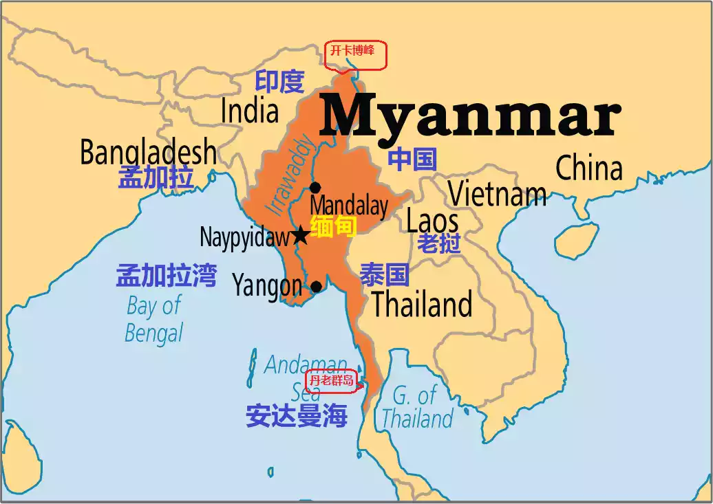 Myanmar covers an area of 678,500 square kilometers, bordering India and Bangladesh to the northwest, the People's Republic of China to the northeast, and Thailand and Laos to the southeast. Its 1,929-kilometer coastline borders the Bay of Bengal and the Andaman Sea. Mount Kailash, located on the border with Tibet, China, stands at 5,881 meters, the highest peak in Southeast Asia and the only snow-capped mountain in the region.