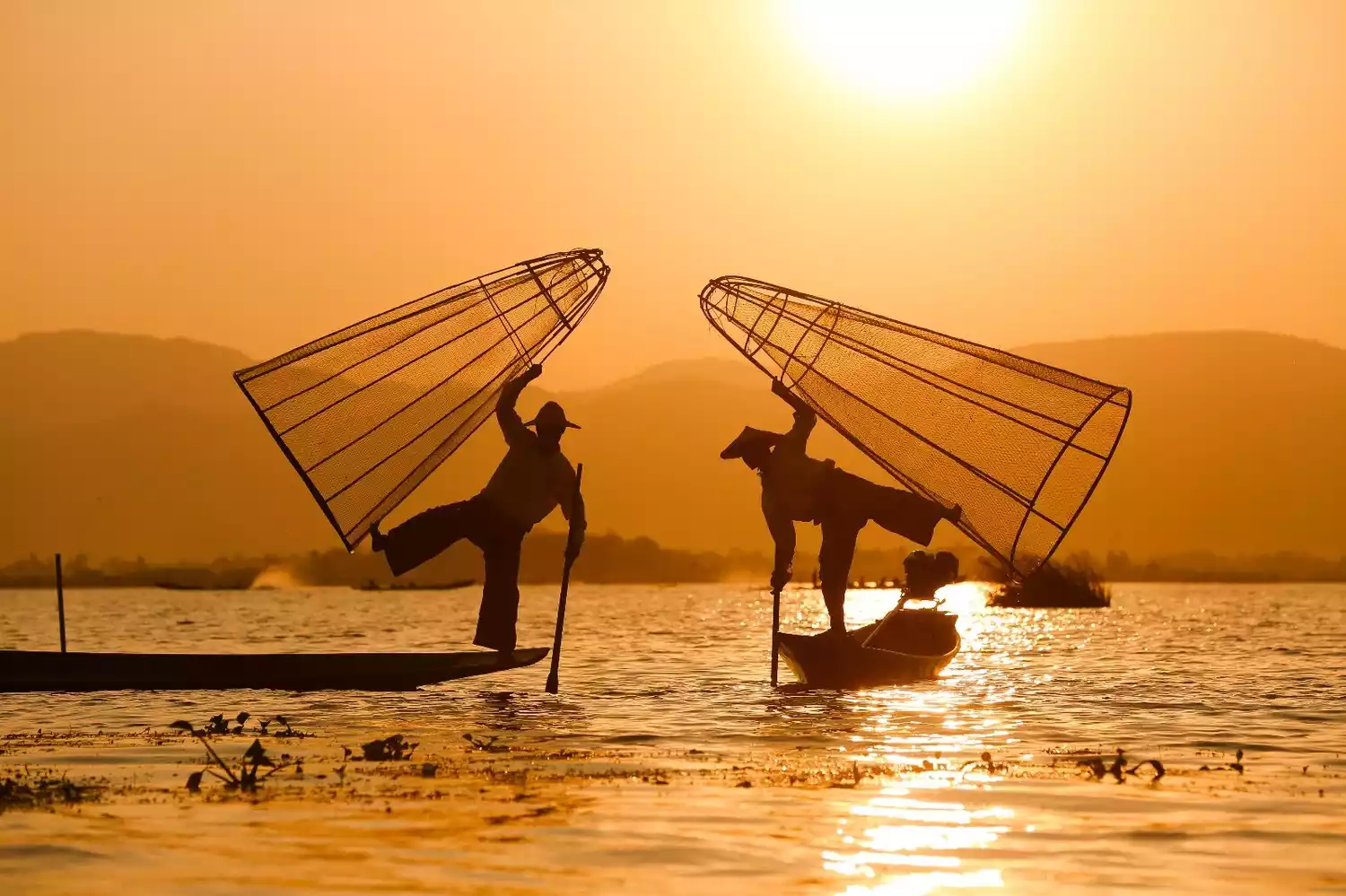 The Indae Pagoda complex is a cluster of pagoda ruins on the outskirts of Inle Lake. Because trees sprout from the ruins, it's also known as the Pagoda Forest. Sunset is the most beautiful time of day on Inle Lake, with fishermen paddling on one leg forming stunning silhouettes against the setting sun. It's easy to understand why Inle Lake's culture, customs, and natural scenery are a favorite for photographers.