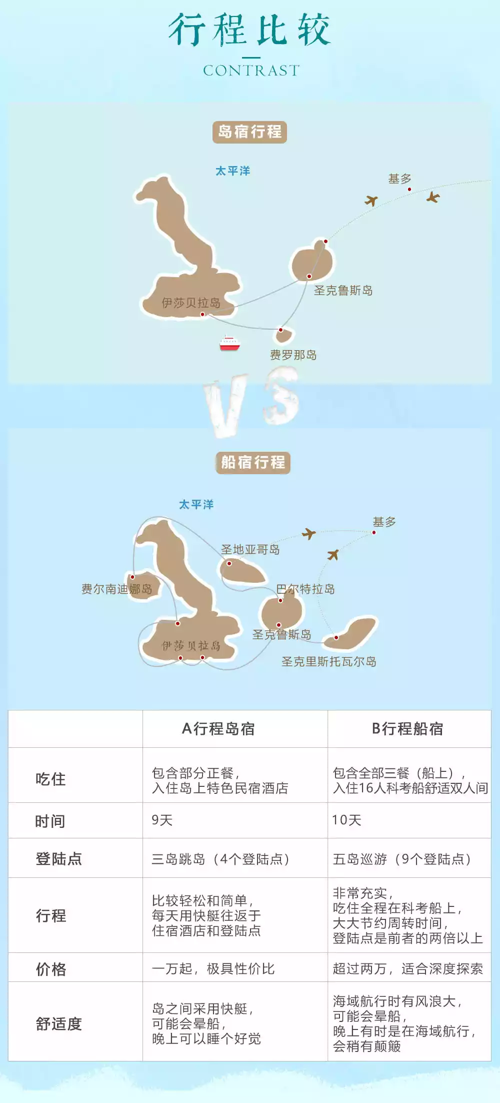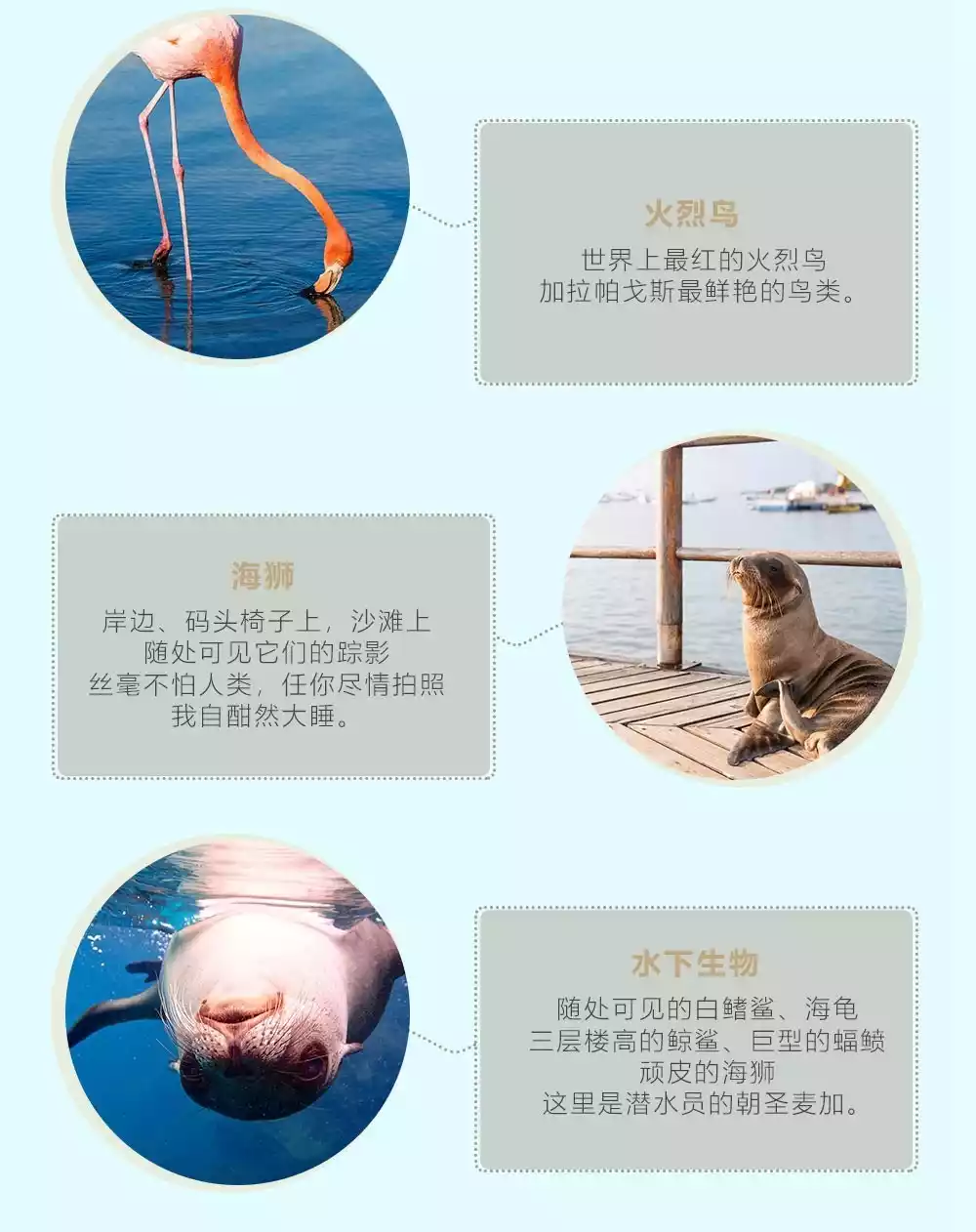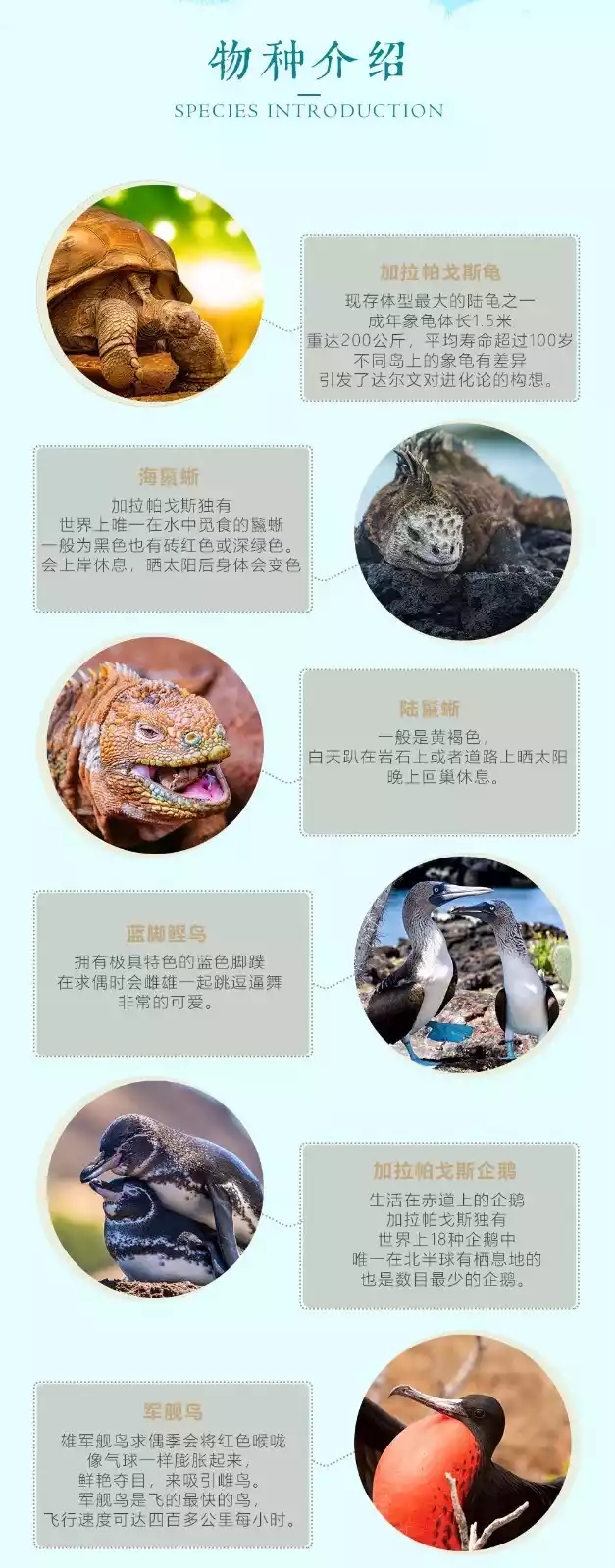 Far away from the South American continent and isolated from the world, species have evolved independently here, and there are many unique biological species; the large amount of nutrients brought by the Peruvian cold current has continuously washed away the species resources here, making the species resources here extremely rich; the archipelago was born in a volcano, and with the continuous cycle of the volcano's life cycle, each island has its own characteristics; and the distance between the islands is far enough, resulting in different species on each island.