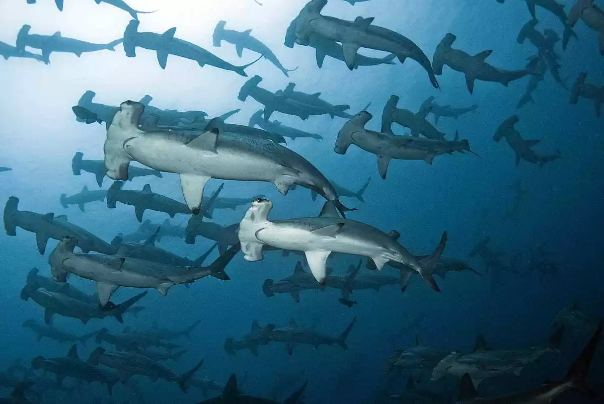 Hundreds of hammerhead sharks are floating by.