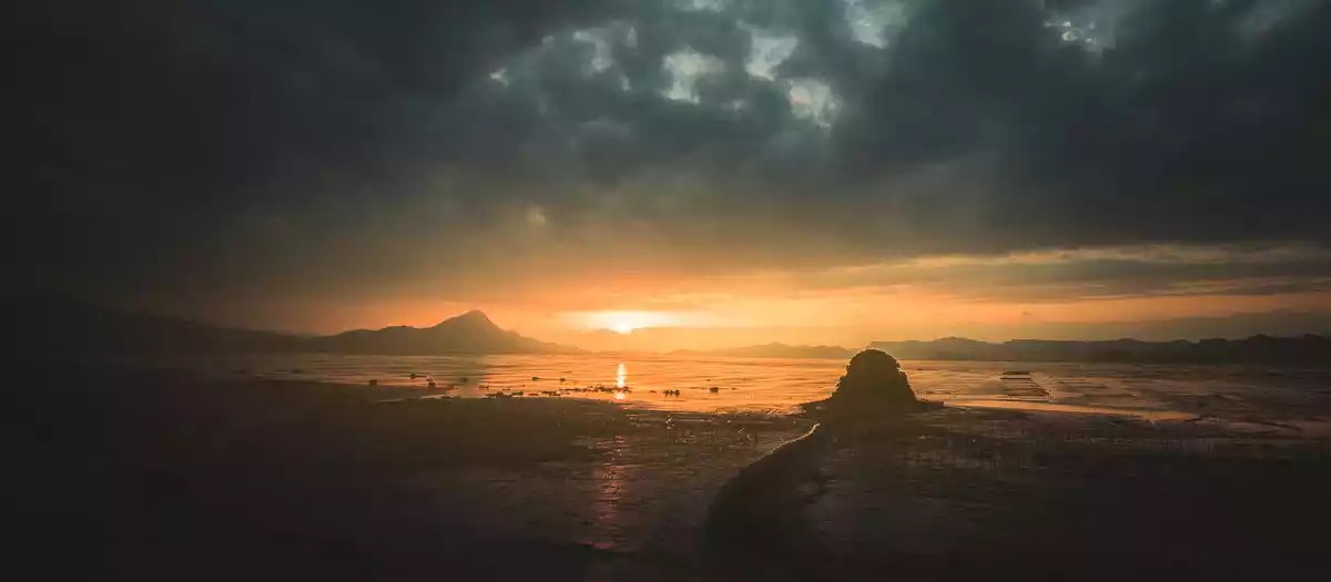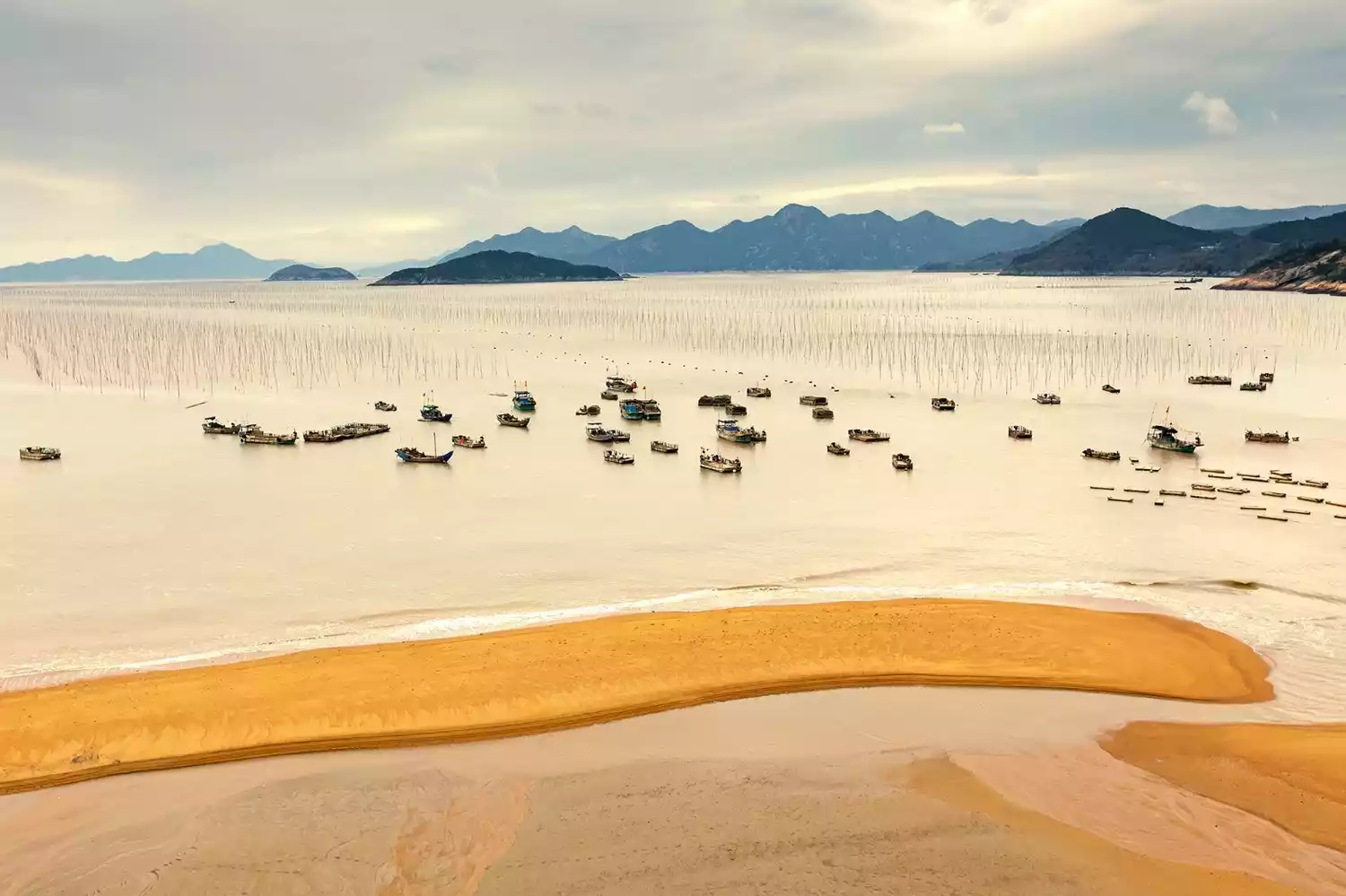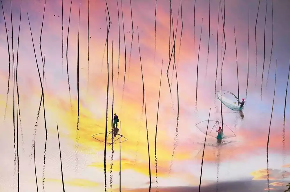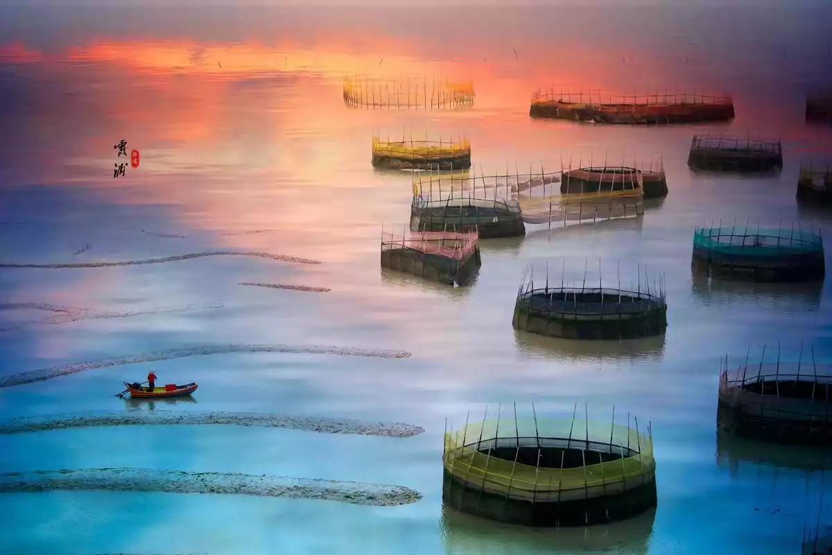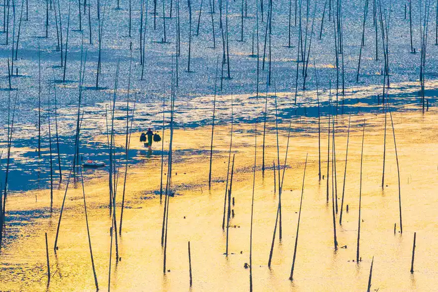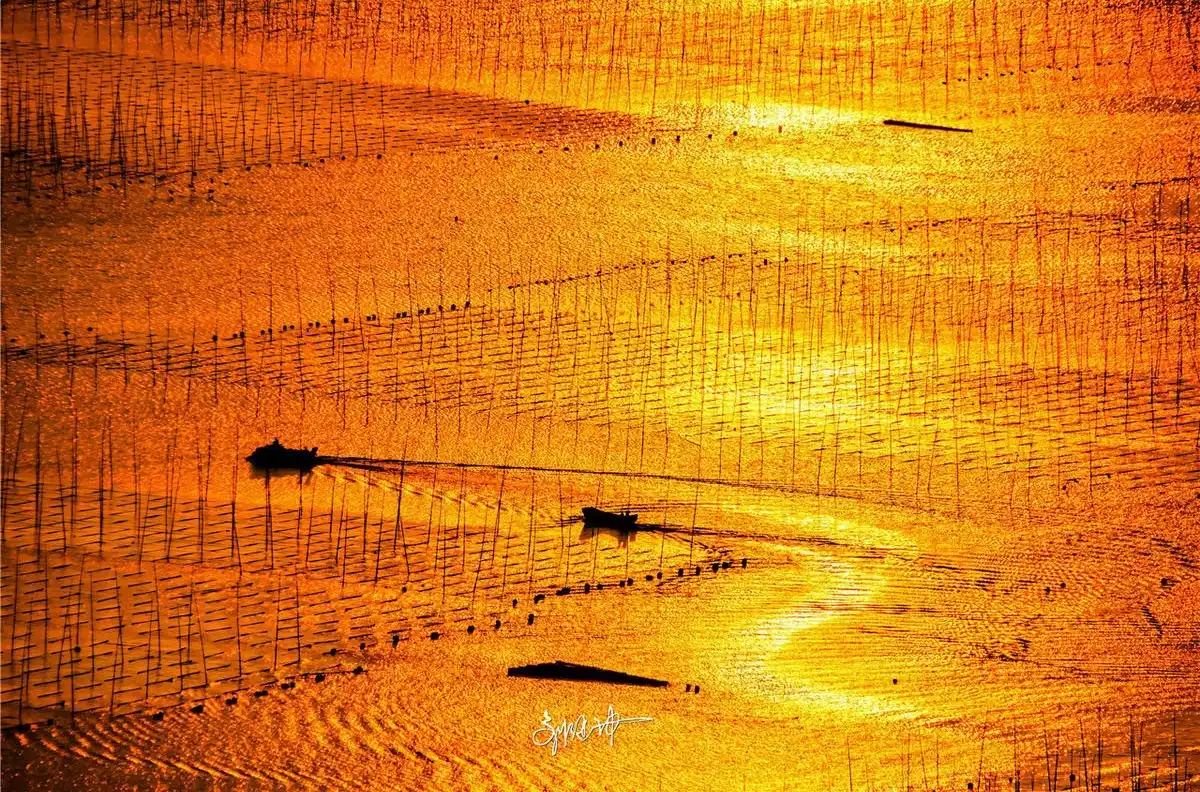 Xiapu is known as China's hometown of kelp and laver. CCTV's "A Bite of China" featured laver farming in Xiapu. Laver cultivation, one of the two major annual activities for photographers in Xiapu, is harvested after the Mid-Autumn Festival in the eighth lunar month. The autumn sunlight softens, and sunrise and sunset views become more favorable, as seen in places like Beiqi, Xiaohao, and Dongbi. Bathed in the golden sunlight, the beaches and mudflats take on a mature charm. Especially in early autumn, the sea is bustling with fishing rods and ropes, tending and harvesting, and boats plying the waters. The shadows of poles, boats, and people interplay, capturing the beauty of the lines in photographers' cameras. The scene of laver farming continues into the following spring.
