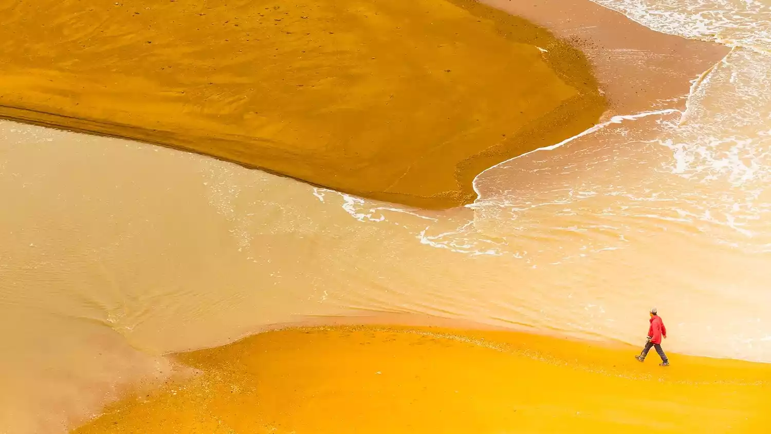 There is a winding waterway on the beach, with a small stream running through it, washing out a complex and varied texture. The soft lines appear golden in the afterglow of the sunset.