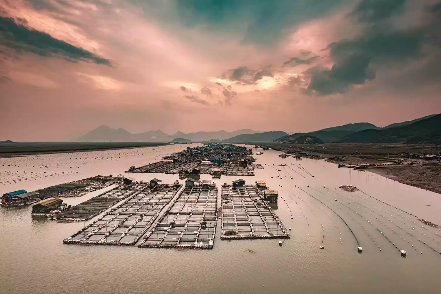 On the mudflats, thousands of bamboo poles are inserted into square net frames that stretch for dozens of miles. In the direction of sunrise, there is a clear circular bay between the seaweed rows. When there is timely light and fishing boats, it will be perfect.