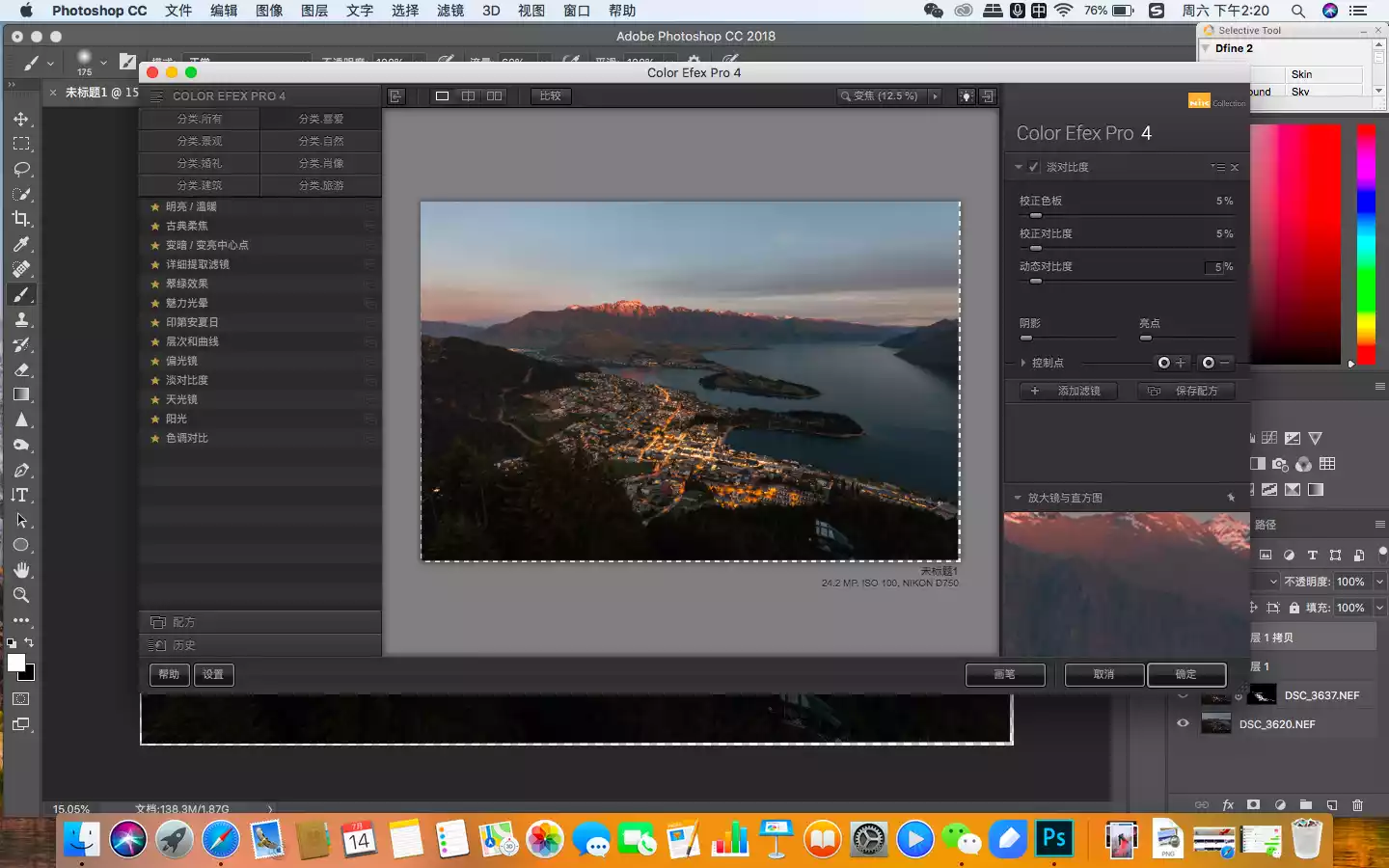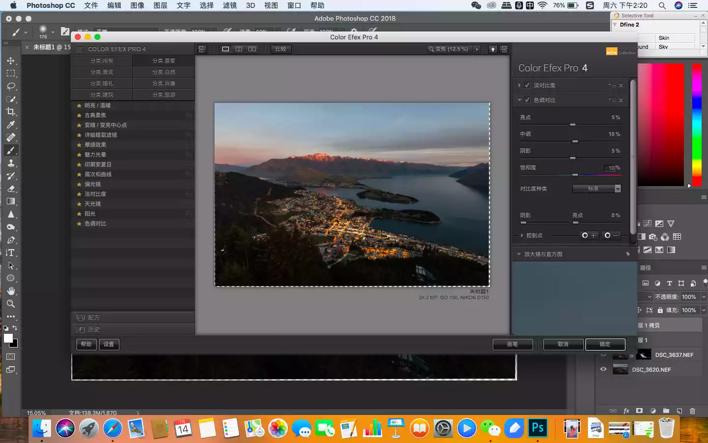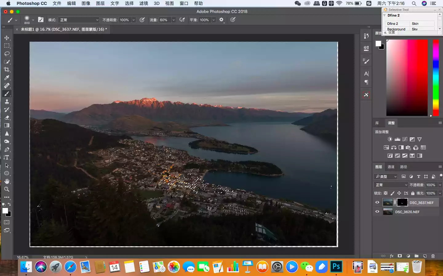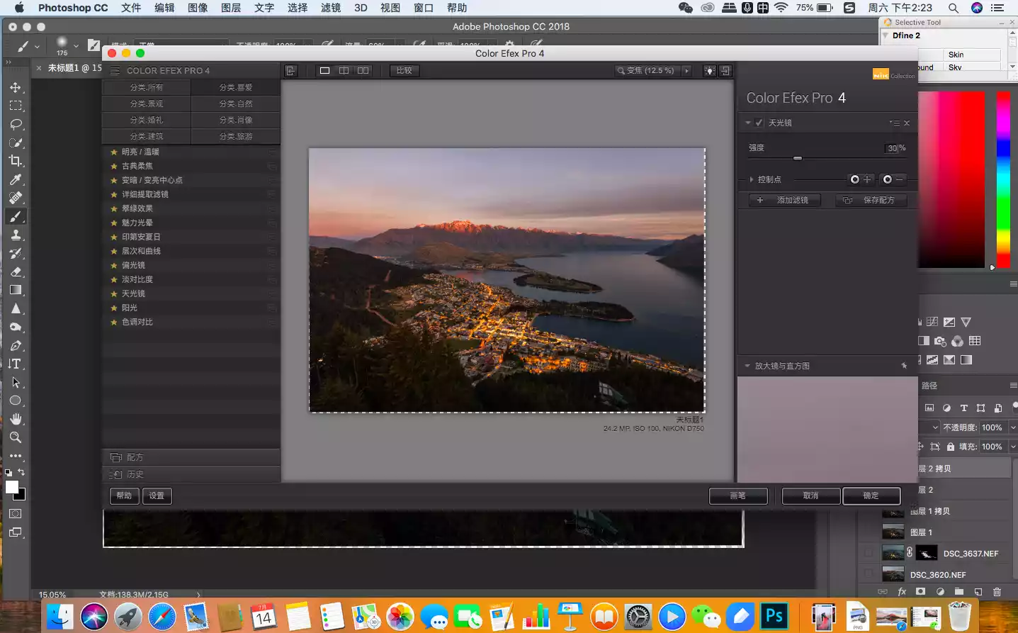In this picture, the areas that need to be enhanced are the buildings in the town and the snow-capped mountains in the distance, so I used the mask function of the filter's automatic recognition to select them.