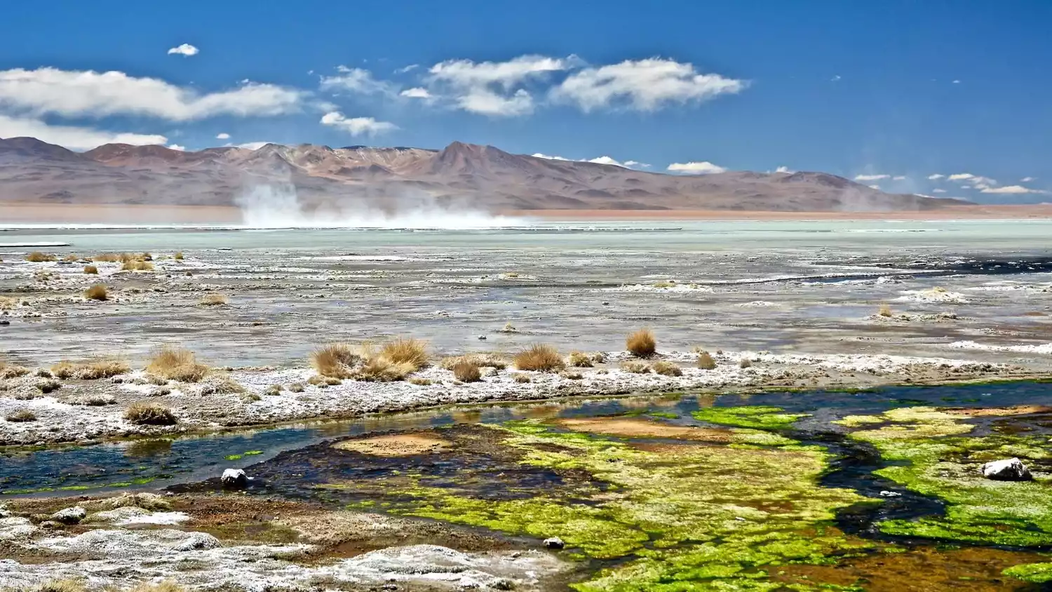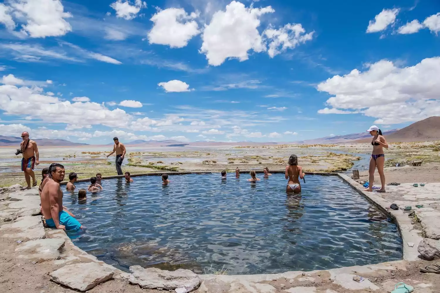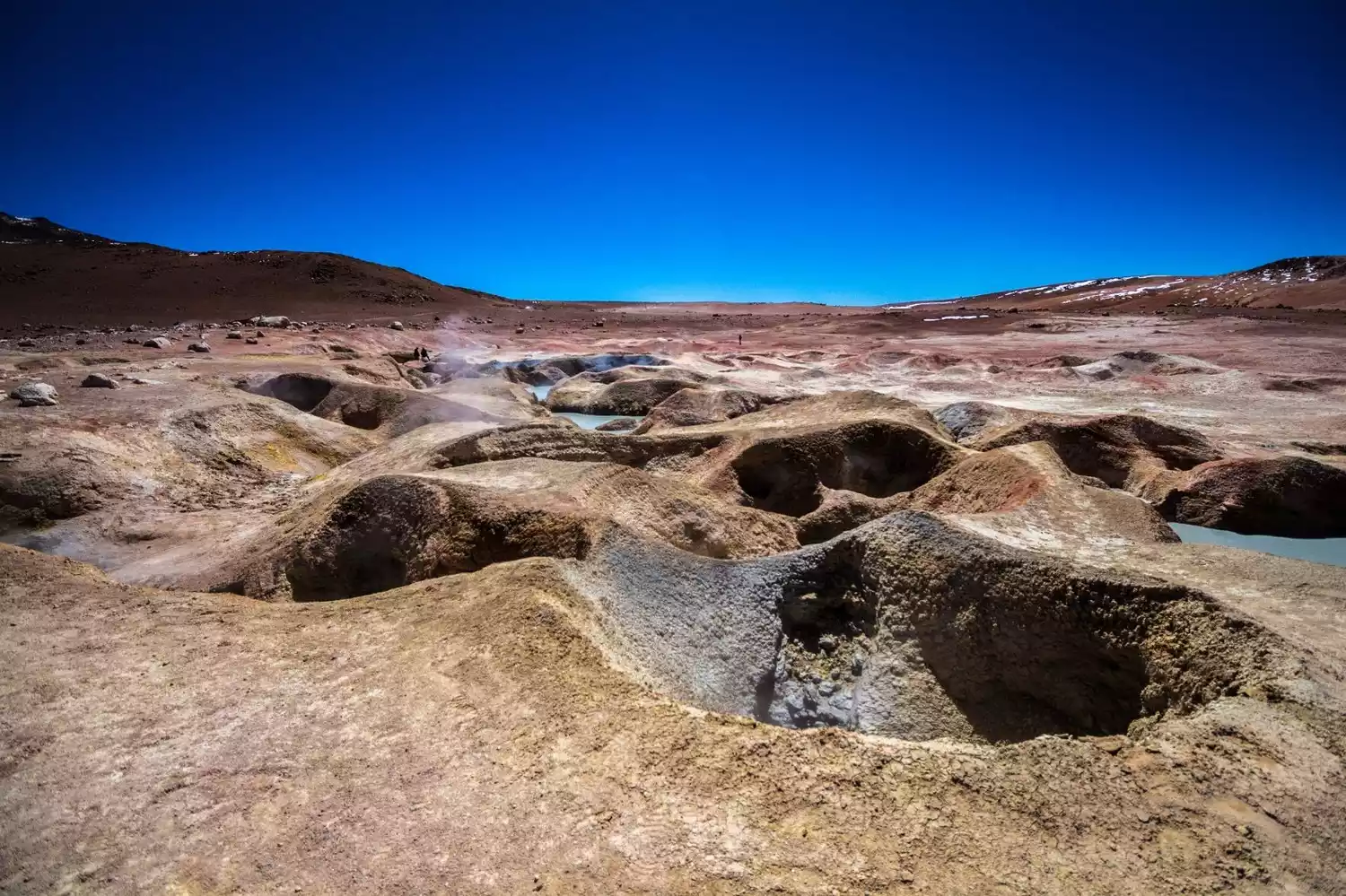 Leaving the two lakes, we sped across the South American plateau, crossing the Daly Desert (Desierto Dali), admiring the vast expanse of desert along the way. This region still maintains a high mountain and desert climate, with the air being extremely dry yet exceptionally clear, making the distant mountain scenery even more breathtaking. In the distance, tiny four-wheel drive vehicles whizzed across the desert like mayflies, stirring up clouds of dust. The scene was quite picturesque, but following too closely or being overtaken by another vehicle was a disaster, as the dust would hit us in the face. Since our jeep travels in these areas year-round, the air conditioner was so dusty that even opening it would be dusty, so we didn't turn it on. The temperature outside the window wasn't particularly high, but closing the windows made it stuffy, so we had to open them. However, keeping them open meant constant dust, which we had to close quickly. Even so, we still inhaled quite a bit along the way. It took about an hour to reach Salar de Chalviri, another highland salt lake. Next to the lake are the hot springs of Termas de Polques. Tour groups departing from Uyuni will stay here for one night. Imagine, after a tiring day and the brilliance of the plateau, you drag your tired body into this hot spring pool under the snow-capped mountains, and instantly all your pores open up. It's such a pleasurable feeling! Best of all, this fairyland-like high-end experience only costs 6 yuan!
