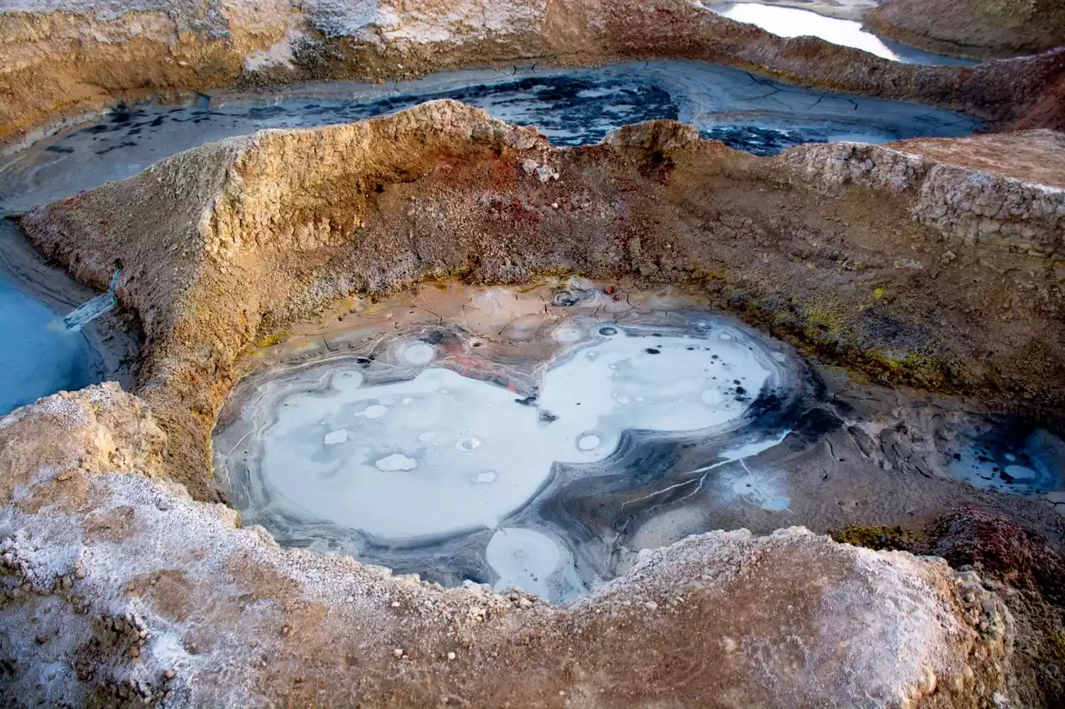 This is the highest point we've visited within the nature reserve, reaching an altitude of 4,885 meters. Sol de Mañana means "morning sun" in Spanish, and Geiser Sol de Mañana roughly translates to "Rising Sun Geothermal Spring." However, this isn't a geyser zone, as you might imagine, but rather a geothermal field consisting primarily of steam and mud pools. The most iconic feature is a steam pool, which is constantly bubbling with steam. It's said that the pressurized steam erupts up to 50 meters each morning. The geothermal field is much more beautiful than the El Tatio geyser we visited earlier in Chile. It features numerous, bumpy, gray-white hot mud pools, fringed by yellow sulfur traces. Further away, orange and white soil creates a rich, beautiful layering of colors.