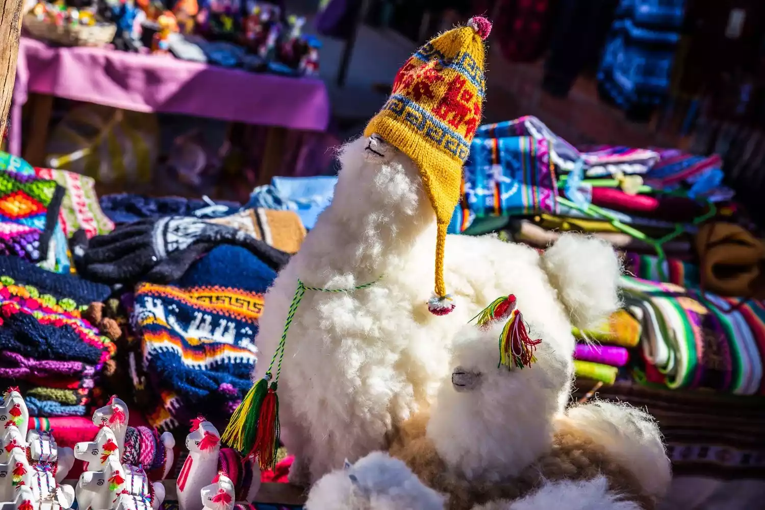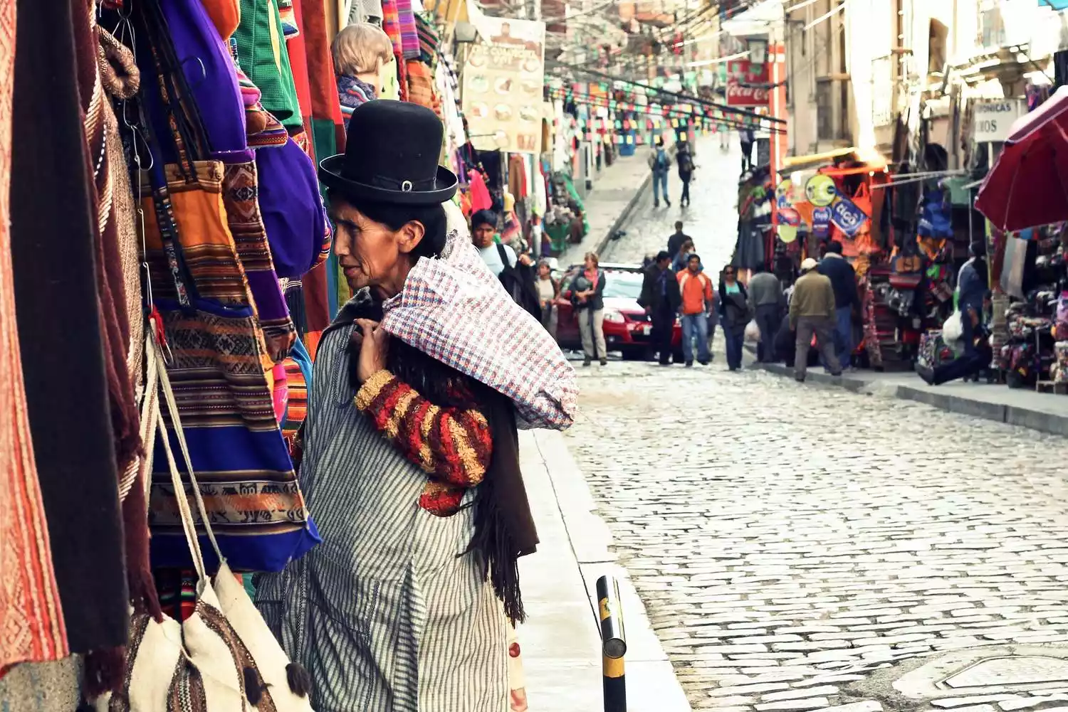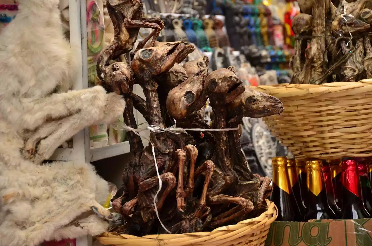 The Witches' Market! This is probably a very important reason to stop in La Paz. It sounds rather mysterious and eerie, but it's actually a street selling Bolivian souvenirs, including alpaca wool products and other strange and indescribable trinkets. Many shops have dried alpaca carcasses hanging in front of them, which is quite disgusting. It's said that locals bury these animals when building houses for good luck. Walking around, the air is filled with the unpleasant smell of herbs. There are actually many similar places around the world, such as Sonora, Mexico, and Togo, Africa.