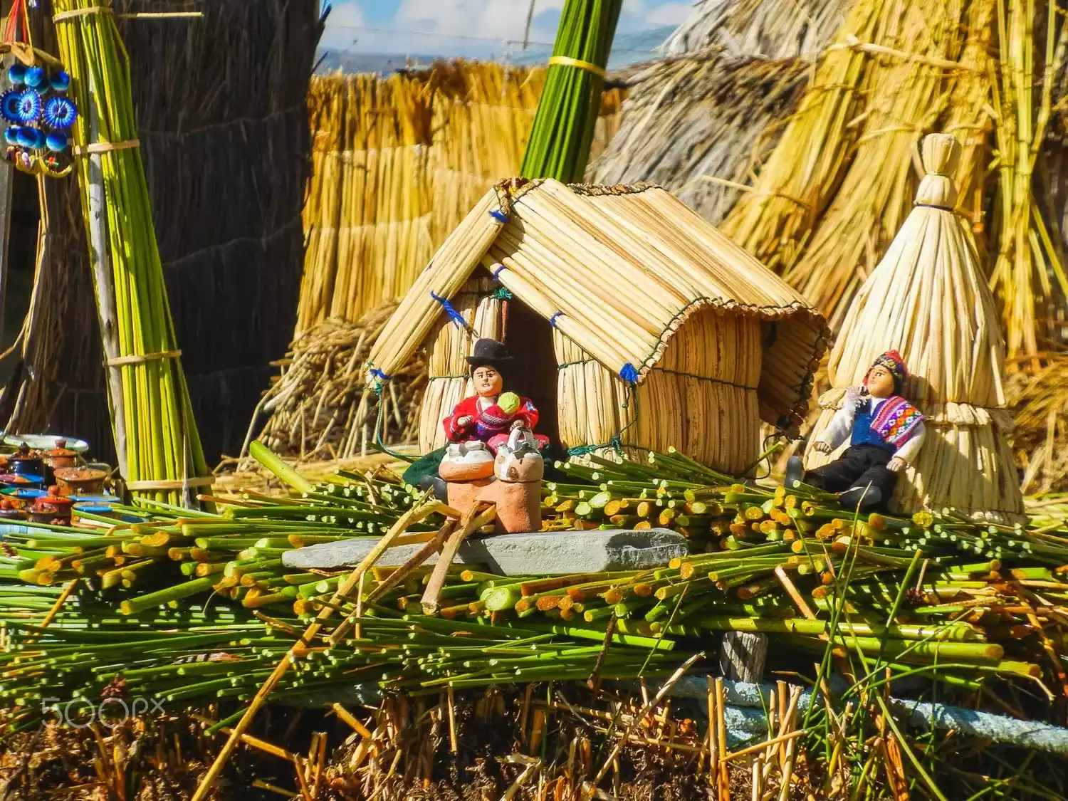 Layer upon layer of reeds is then laid on the foundation, raising the island above the water. Then, various thatched houses are woven from reeds, a process that takes several months. Because living in such a place is very humid, the houses are usually raised two steps. A new layer of reeds must be laid on the island every two weeks to prevent it from becoming soaked. The island owner demonstrated this by gently digging a small hole. The reeds underneath are wet, and a handful can be wrung out like a towel. These floating islands typically last 30-35 years, but the roots naturally decay and dissolve, eventually weakening the island and forcing a new one to be built. Thus, this craft has been passed down from generation to generation.