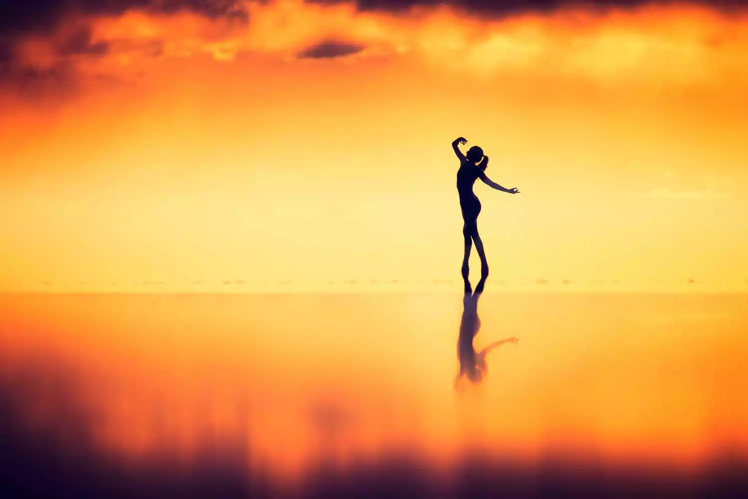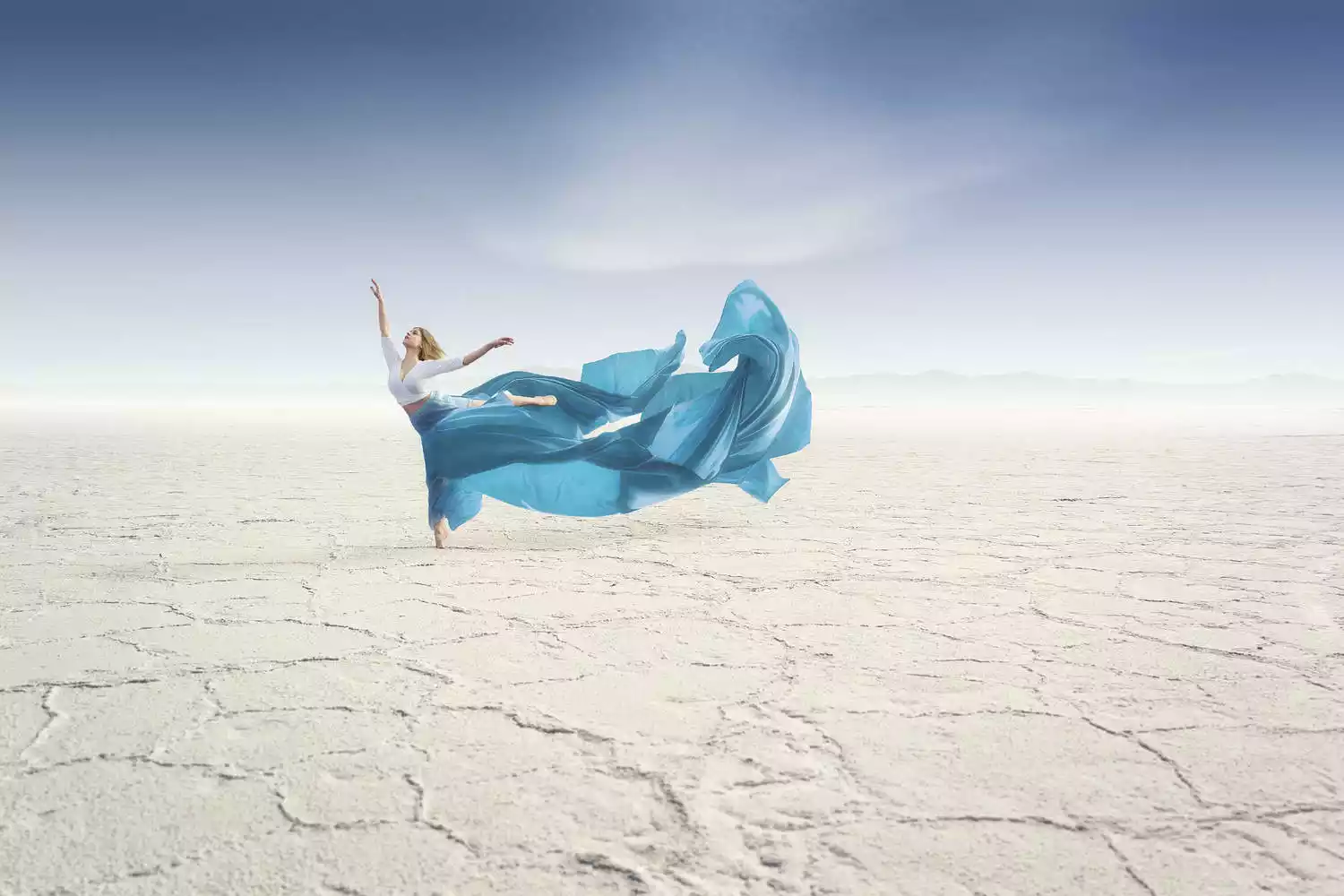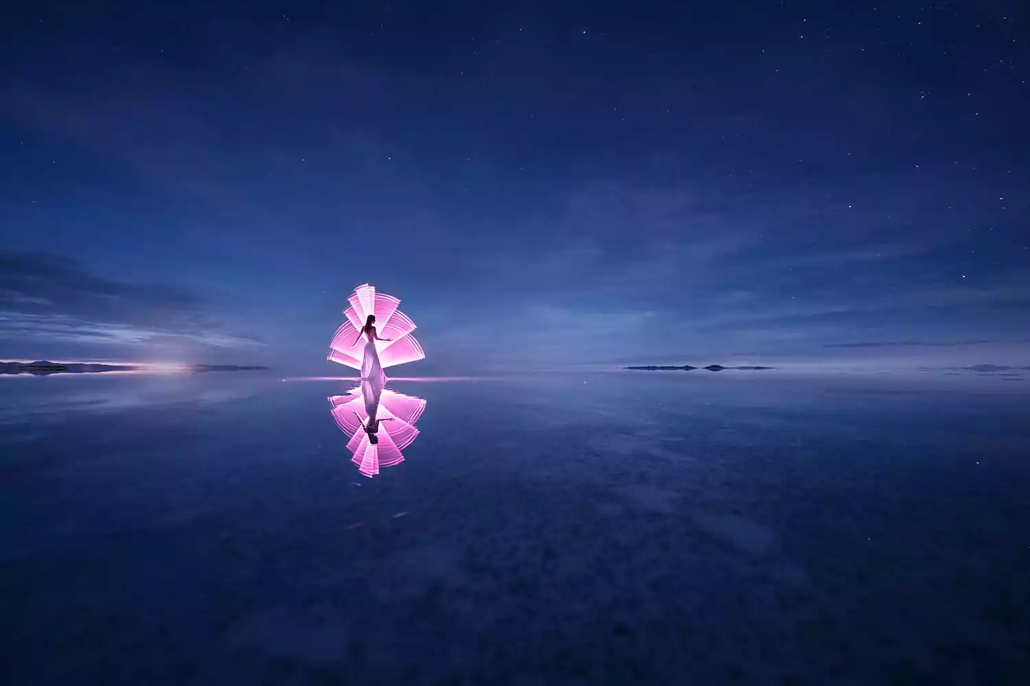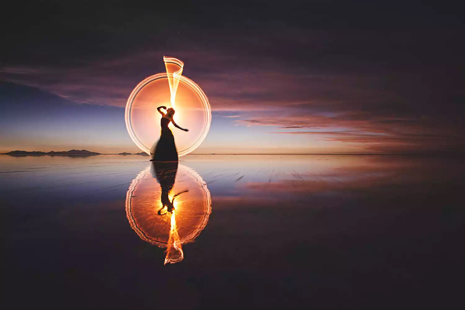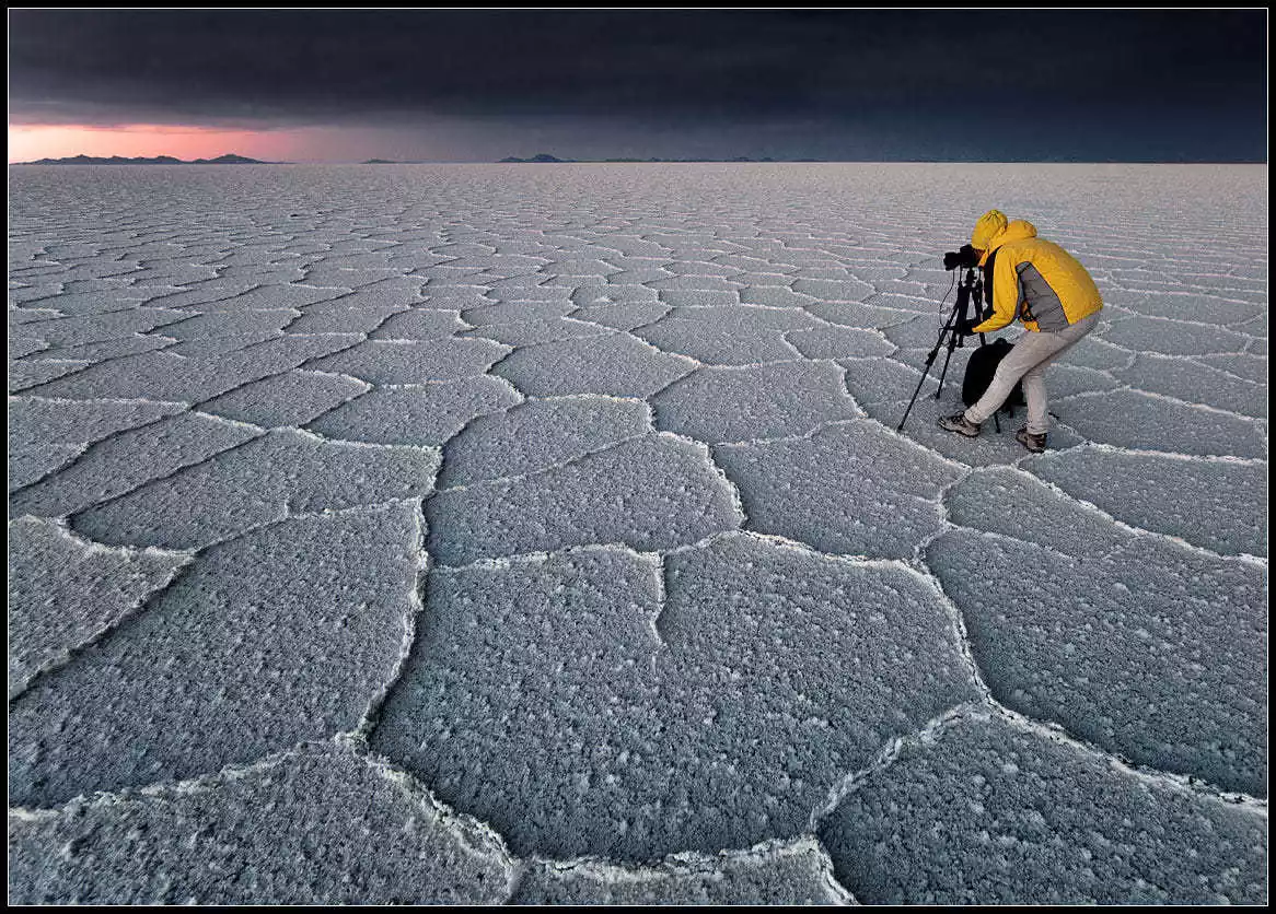 The endless, flat, arid salt pans have always been a place where people's imaginations run wild and their creativity is unleashed. Drivers who frequent the area year-round often have a few stock photography routines for tourists. The principle is simple: two people, one in front and one behind, or a prop in front and one behind, positioned at a suitable distance. The camera is kept close enough to the person in front or the prop that the photographer usually has to squat or even lie prone on the ground to create the illusion of immensity while the person behind appears tiny.