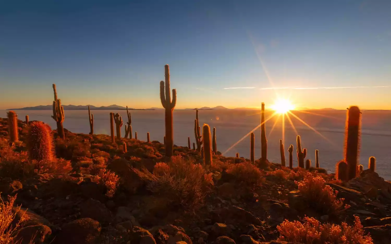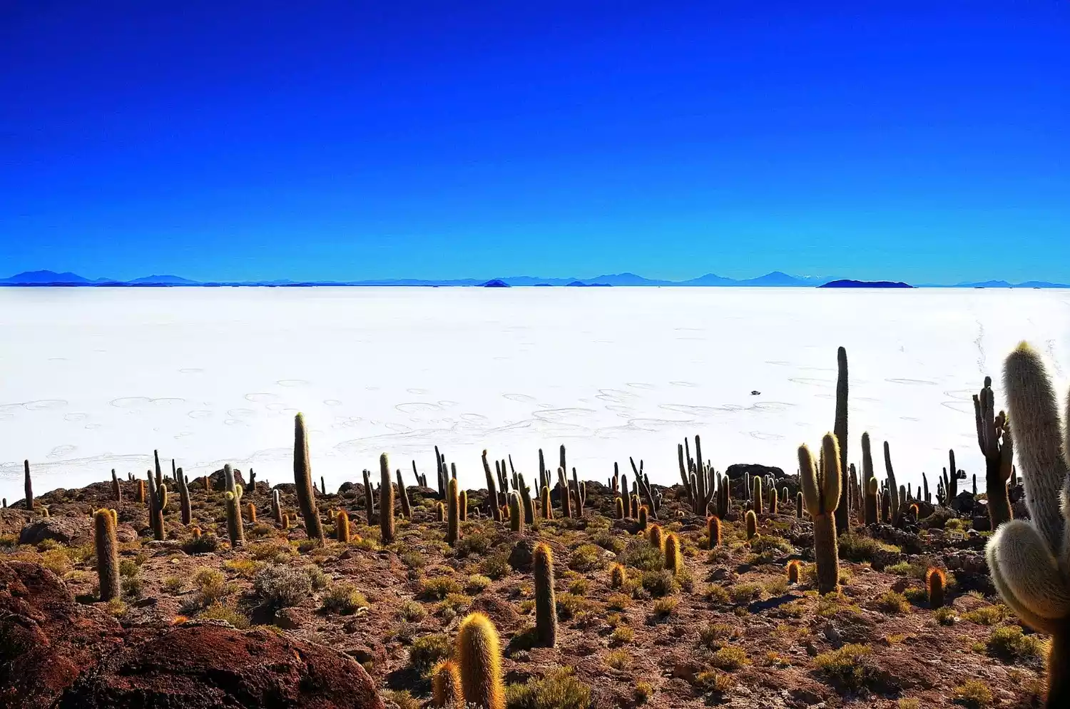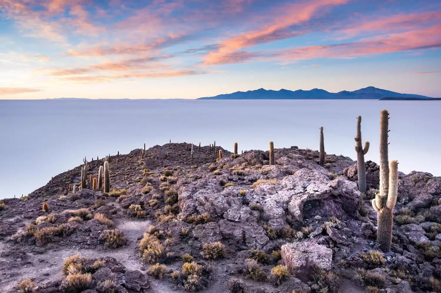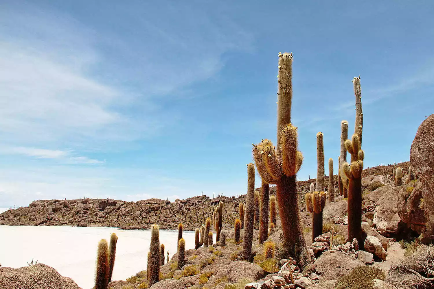 Amidst the vast salt lake lie a number of "islands," the most remarkable of which is Cactus Island, Isla Incahuasi. We watched the sunrise from right next to it, and while it might not seem particularly remarkable from a distance, it was only after we "landed" that we discovered the sheer size of the cacti, covering the entire island with them – a truly breathtaking sight. It's said that these cacti grow about one centimeter per year, and that the cacti on the island are said to be hundreds to thousands of years old. Perhaps they could cultivate to become spirits, right?