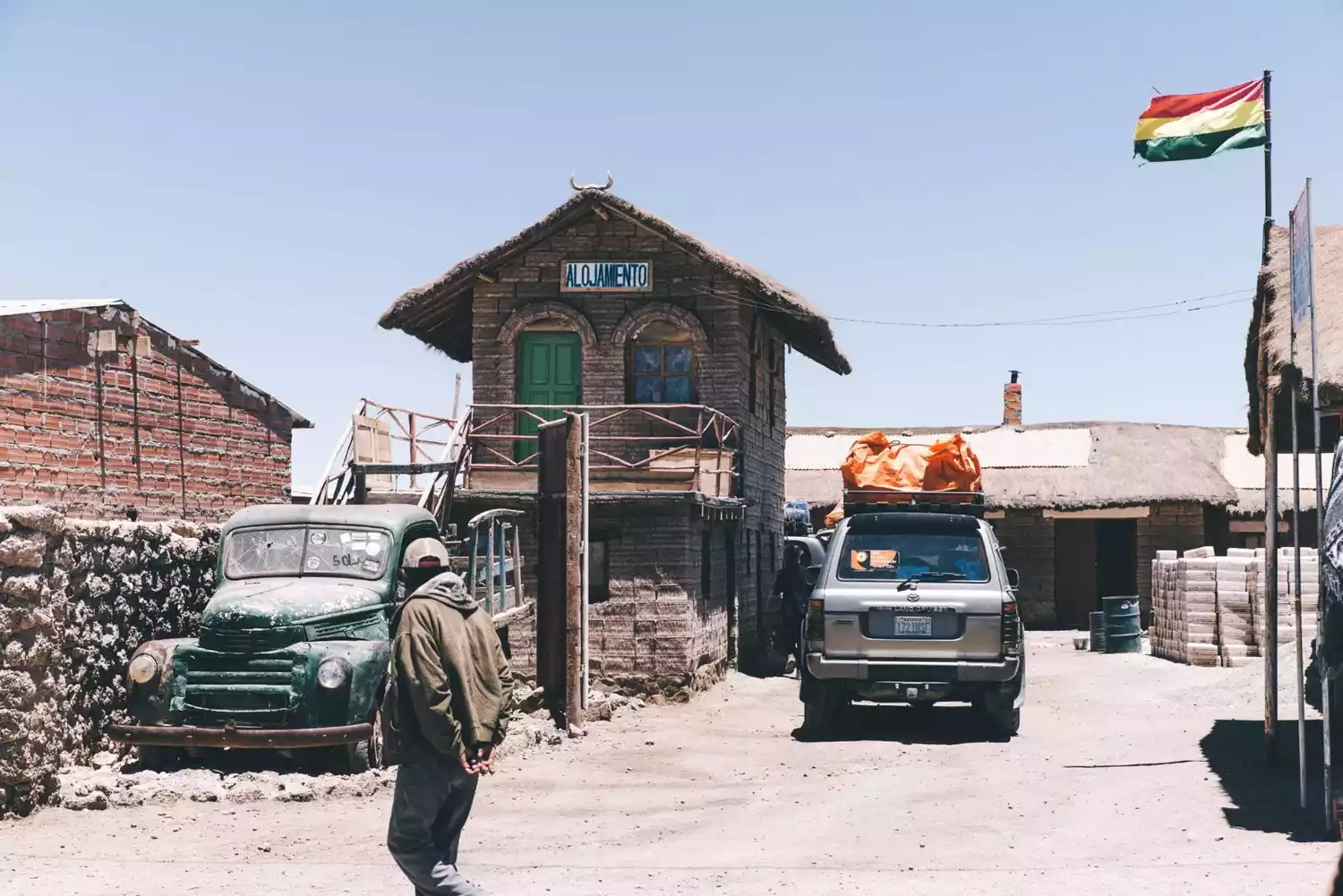 Exiting the salt flats, you'll pass through the village of Colchani, over 20 kilometers from Uyuni town. This is the essential path to the Sky Mirror. Tour groups often stop here for 20-30 minutes to buy souvenirs. It's essentially a simple dirt road, flanked by small shops selling souvenirs, primarily alpaca wool, a vibrant and colorful selection. Costs are relatively low in Bolivia, so regardless of quality, everything sold here is relatively affordable.