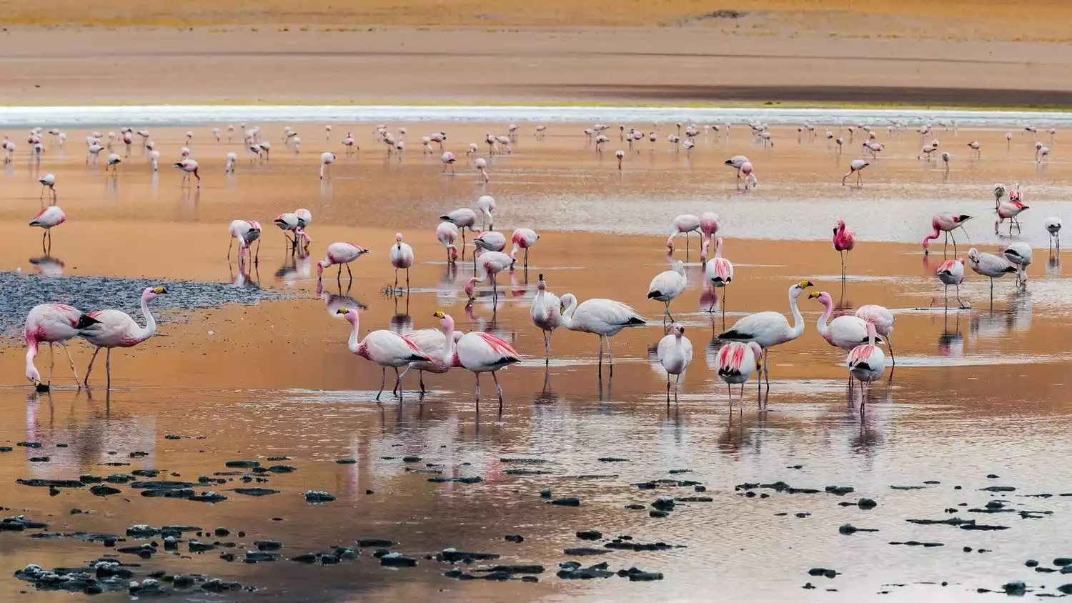After getting off the bus, a biting cold wind swept through, and you suddenly realized that you had gone from summer in Uyuni to winter. We shivered in the chill, wrapped in thin clothes and shorts, and braced ourselves for half an hour, shooting footage. It was truly a challenge. The lake's red color is due to hot springs at the bottom, which nourish a red algae and other microorganisms. Furthermore, the lake is dotted with large expanses of white borax deposits, creating a striking contrast with the red. The interweaving of various shades of color creates a rich tapestry of colors, a true visual feast. A bit of light in the morning or evening would have created an even more vibrant and striking scene. From above, the flamingos quietly foraging on the lake's surface resembled scattered musical notes, their reflections like overlapping chords, composing a beautiful visual score.