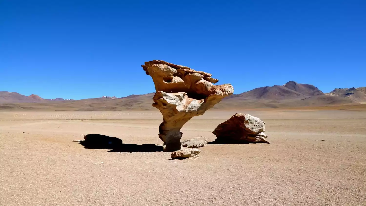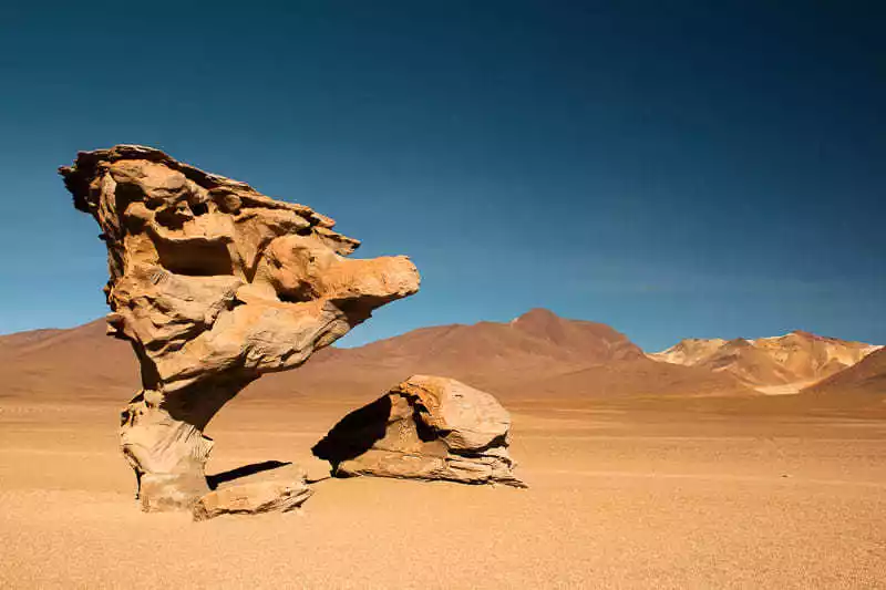 Entering the Siloli Desert, you'll pass several prominent rock formations amidst the flat sands. Arbol de Piedra (Stone Tree) is particularly striking. Sculpted into a tree-like shape by centuries of wind and sand erosion, it's narrow at the base and wide at the top, creating a unique shape that will amaze you with the wonders of nature.