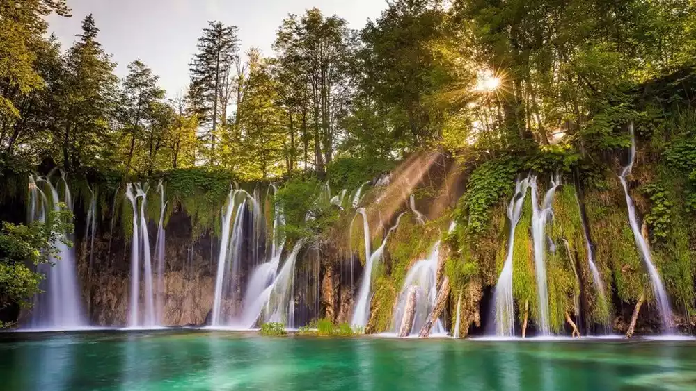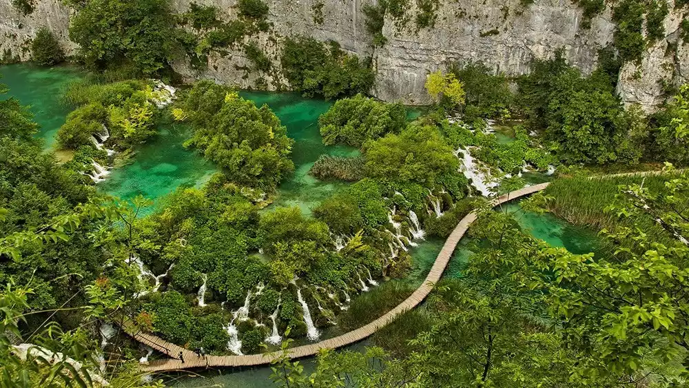 Let's change to Plitvice Lakes National Park. The entire national park is made up of sixteen lakes connected by countless waterfalls, hence the name Plitvice Lakes. The lakes themselves are connected by a series of stepped waterfalls. Isn't that much easier to remember?