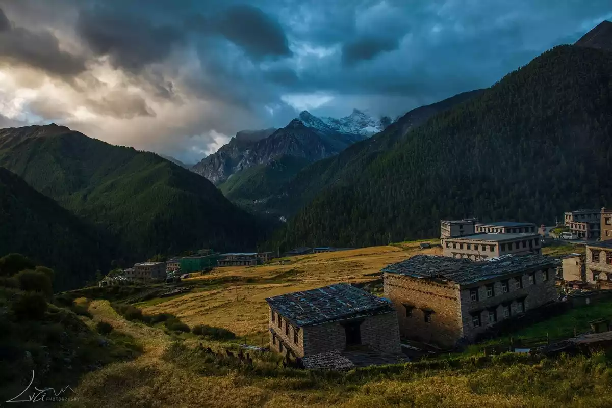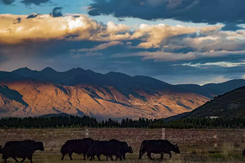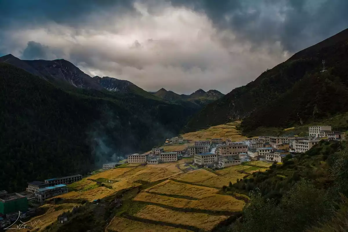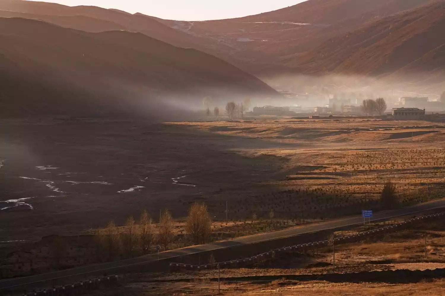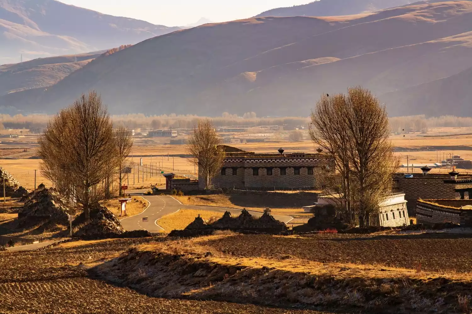 Located next to the river valley beside the road from the county seat to Yading, it is a famous pastoral scenery shooting location around Daocheng. Whenever the sun sets, the fields, villages, rivers and valleys here are shrouded in beautiful light and shadow, making it a place where great films can be produced.