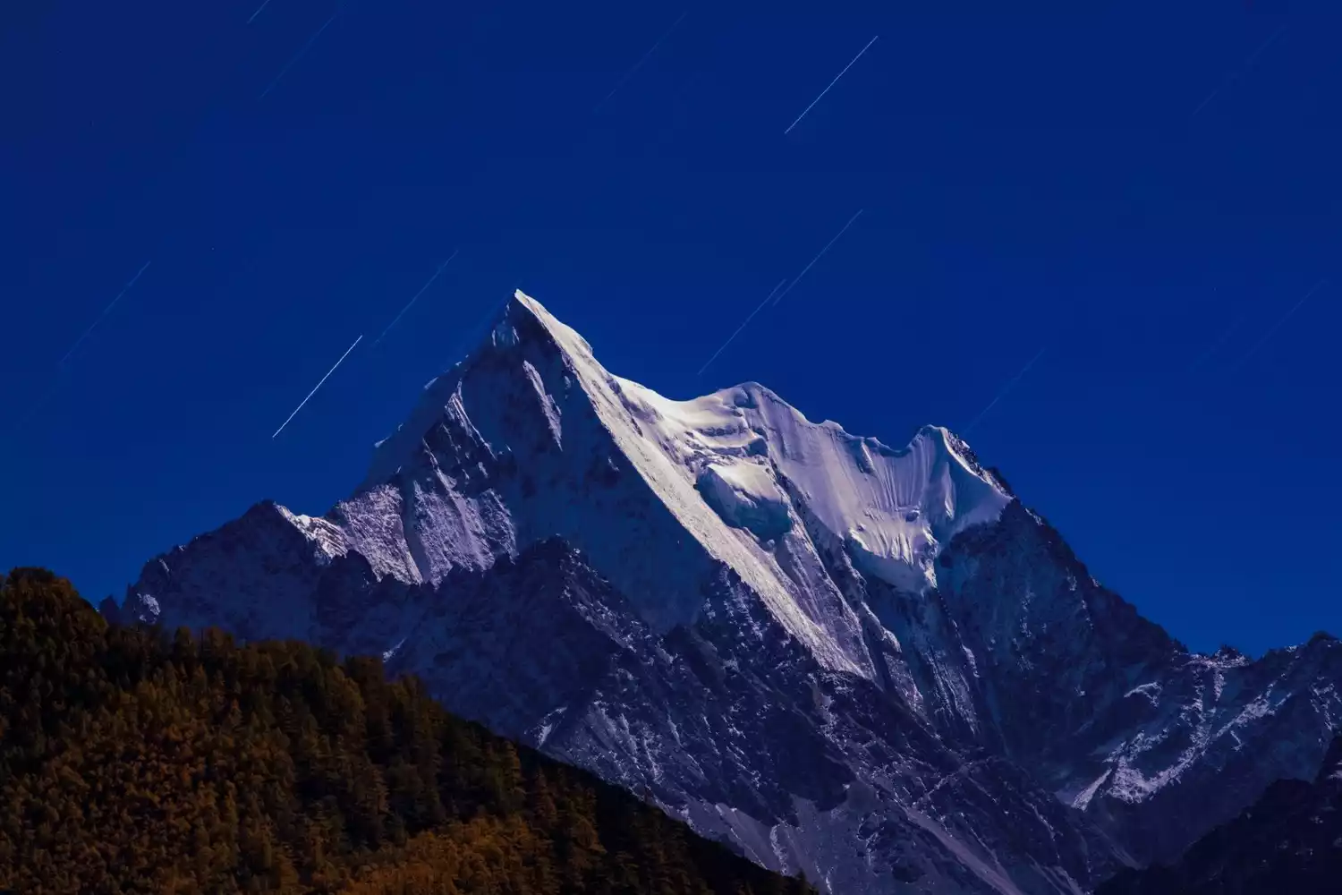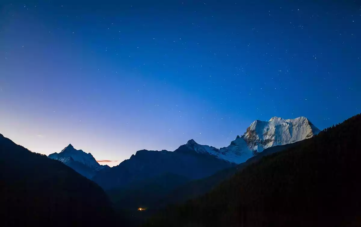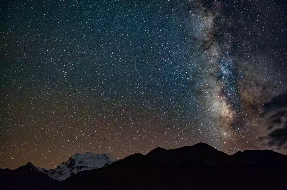 Yading Village is located on the northern slope of the Three Sacred Mountains. Standing in Yading Village, you can see Xiannairi and Xianuoduoji, two of the Three Sacred Mountains in Daocheng. At the same time, the entrance platform and rooftop terrace of the Da Chong residential building at the entrance of Yading Village, as well as the roadside about 500 meters away from Station No. 1 outside the village are the best places to photograph the starry sky in Yading Village.