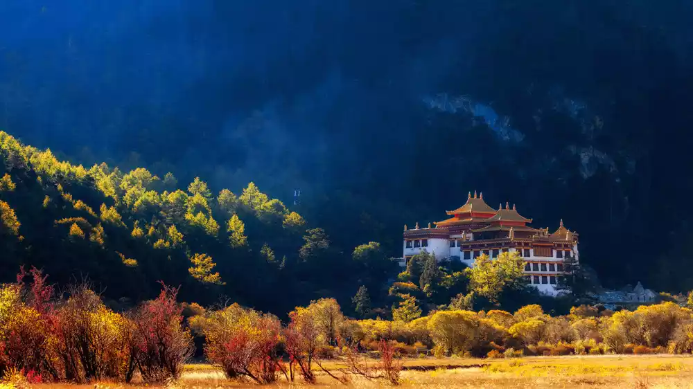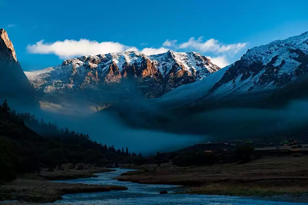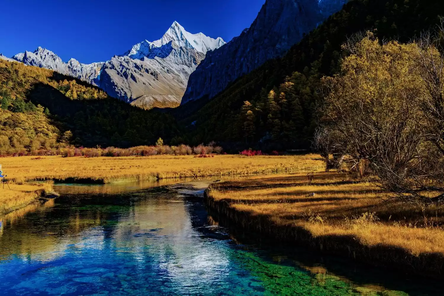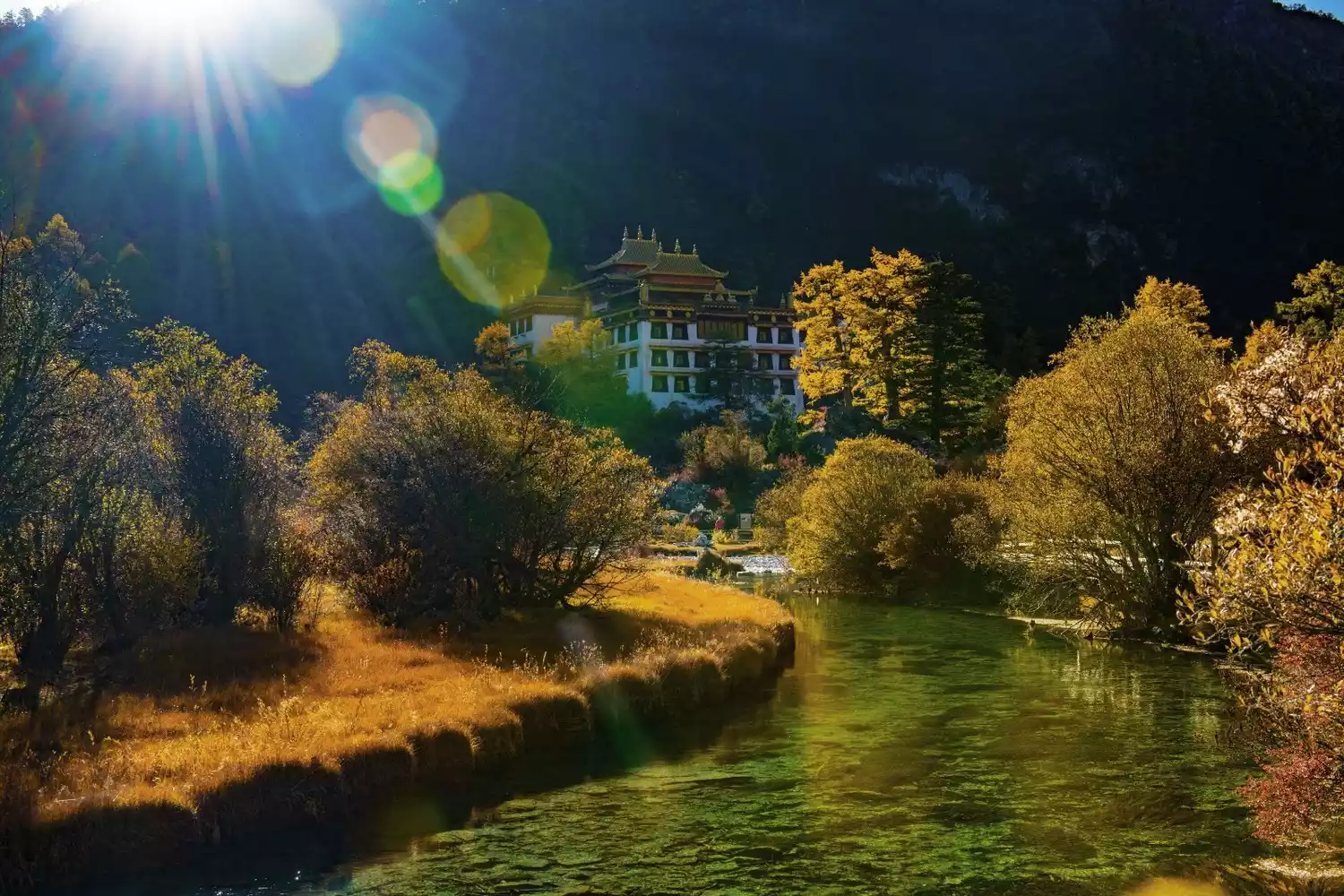 Walking to the riverbank in Chonggu Meadow, you can capture the scene of the river flowing slowly through the colorful forest with Chonggu Temple in the background. You can also capture the gurgling water of Chonggu Meadow beneath the snow-capped Xianuoduoji Mountain and the sunset over it. If you're willing to hike the five kilometers back to Yading Village, you can also wait for the stars at Chonggu Meadow.