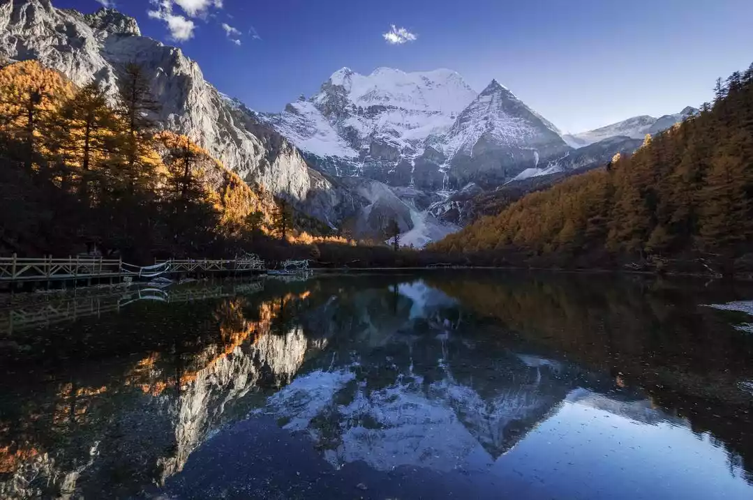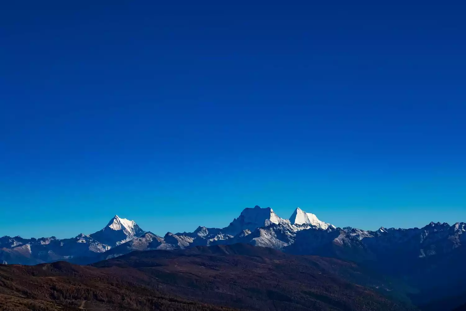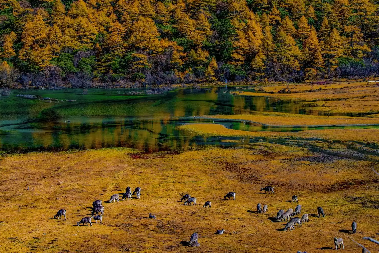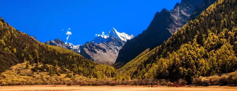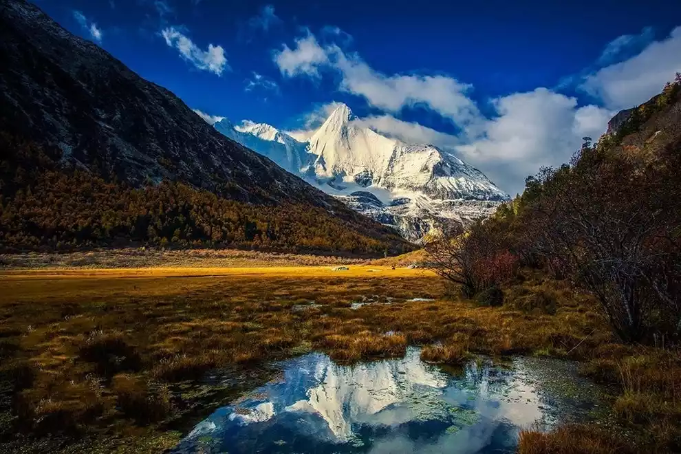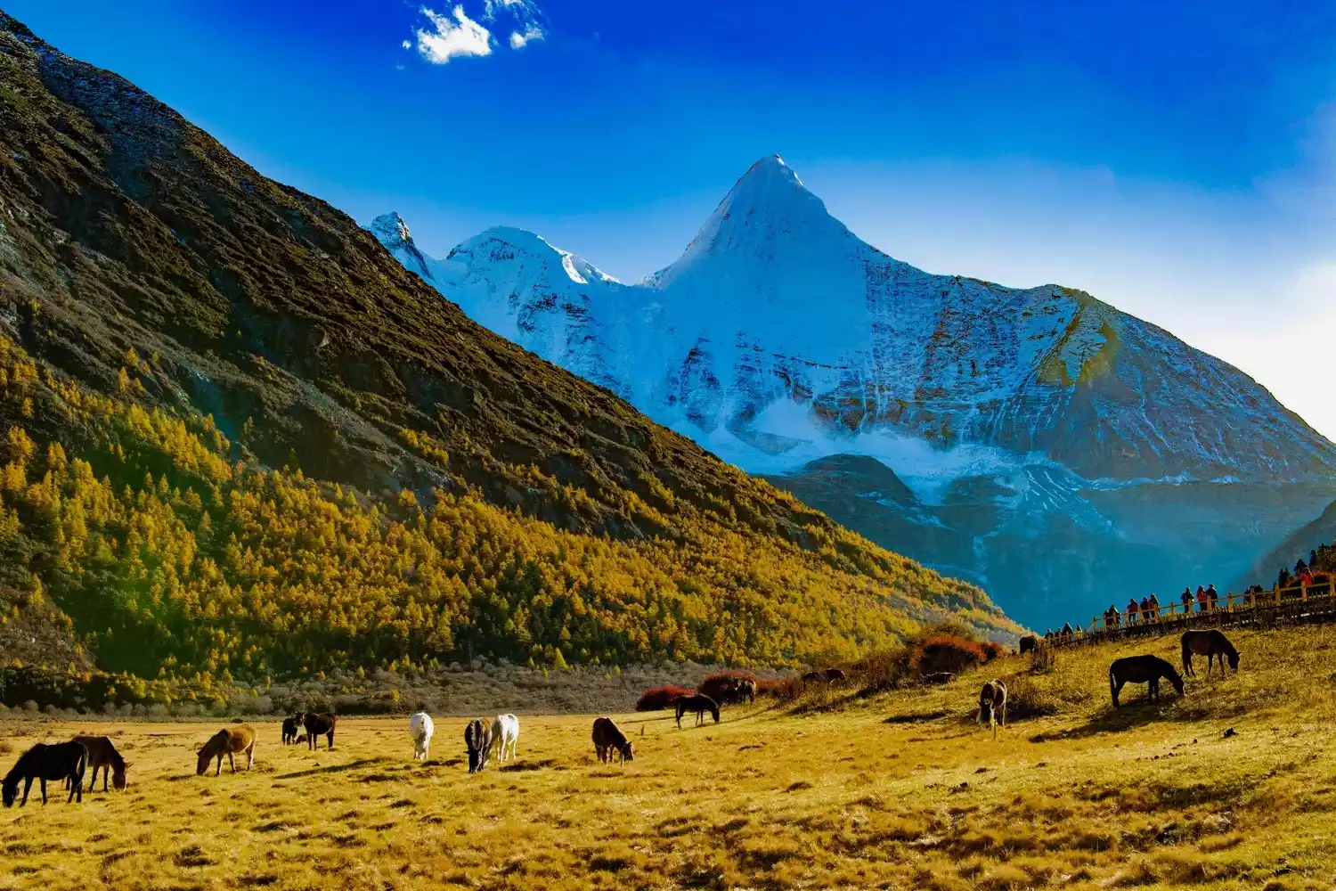 The snow-capped mountains stand majestically under the blue-purple sky of autumn, with the sky sometimes clear and the occasional wisp of clouds passing over the top of the snow-capped mountains; the sun casts mottled light and shadows on the meadows surrounded by snow-capped mountains and nourished by the meltwater of glaciers; the upper forests on the hillsides are dyed with light yellow and deep red, layer upon layer, covering the huge mountain bodies below the snow line of the three sacred mountains, as if putting on gorgeous robes for the three snow-capped mountains that are the incarnations of Bodhisattvas.