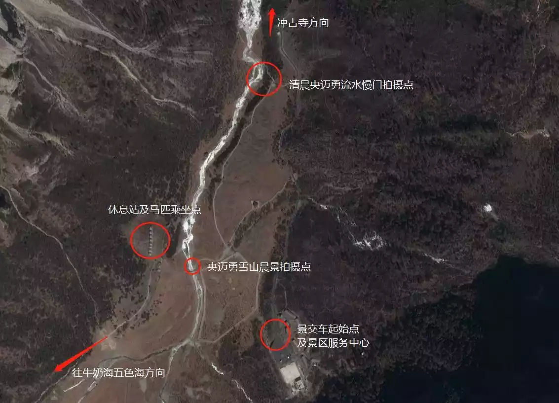 On the way from Chonggu Temple to Luorong Ranch, you'll pass a large platform where you can get off. Before the sun illuminates the snow-capped mountains, you can wander into the jungle and take slow-motion photos with the flowing water in the foreground. However, you'll need to take the earliest bus from Yading Village and transfer to the fastest shuttle bus to Luorong Ranch.